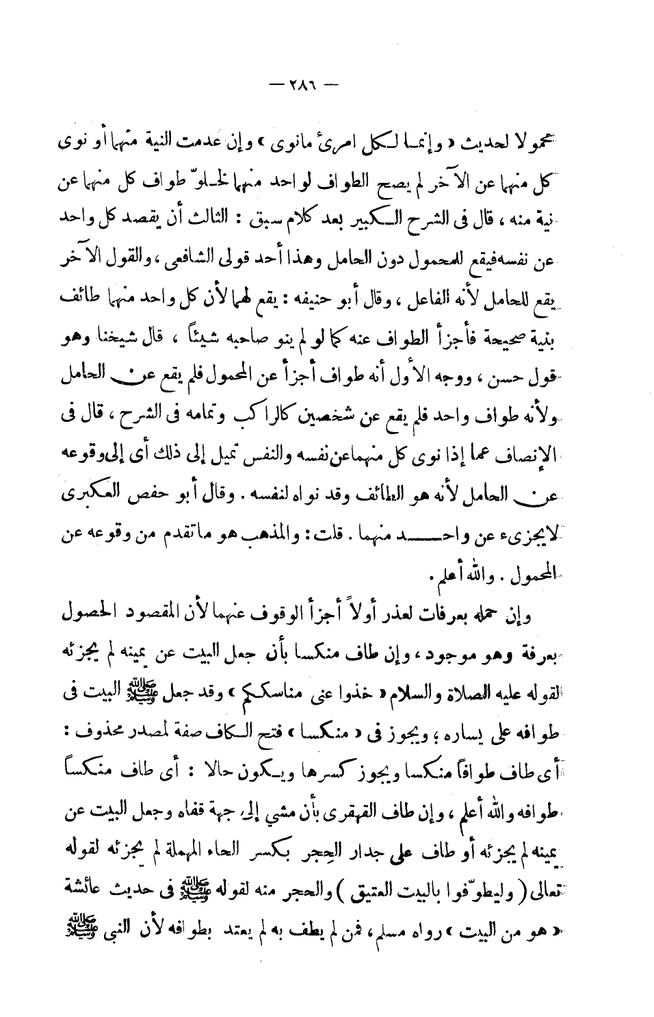 محمولاً لحديث (وإنما لكل امرئ ما نوى) وإن عدمت النية منهما أو نوى كل منهما عن الآخر لم يصح الطواف لواحد منهما لخلو طواف كل منهما عن نية منه، قال في الشرح الكبير بعد كلام سبق: الثالث أن يقصد كل واحد عن نفسه فيقع للمحمول دون الحامل وهذا أحد قولي الشافعي، والقول الآخر يقع للحامل لأنه الفاعل، وقال أبو حنيفة: يقع لهما لأن كل واحد منهما طائف بنية صحيحة فأجزأ الطواف عنه كما لو لم ينو صاحبه شيئاً، قال شيخنا وهو قول حسن، ووجه الأول أنه طواف أجزأ عن المحمول فلم يقع عن الحامل ولأنه طواف واحد فلم يقع عن شخصين كالراكب وتمامه في الشرح، قال في الإنصاف عما إذا نوى كل منهما عن نفس والنفس تميل إلى ذلك أي إلى وقوعه عن الحامل لأنه هو الطائف وقد نواه لنفسه: وقال أبو حفص العكبري لا يجزئ عن واحد منهما. قلت: والمذهب هو ما تقدم من وقوعه عن المحمول. والله أعلم.