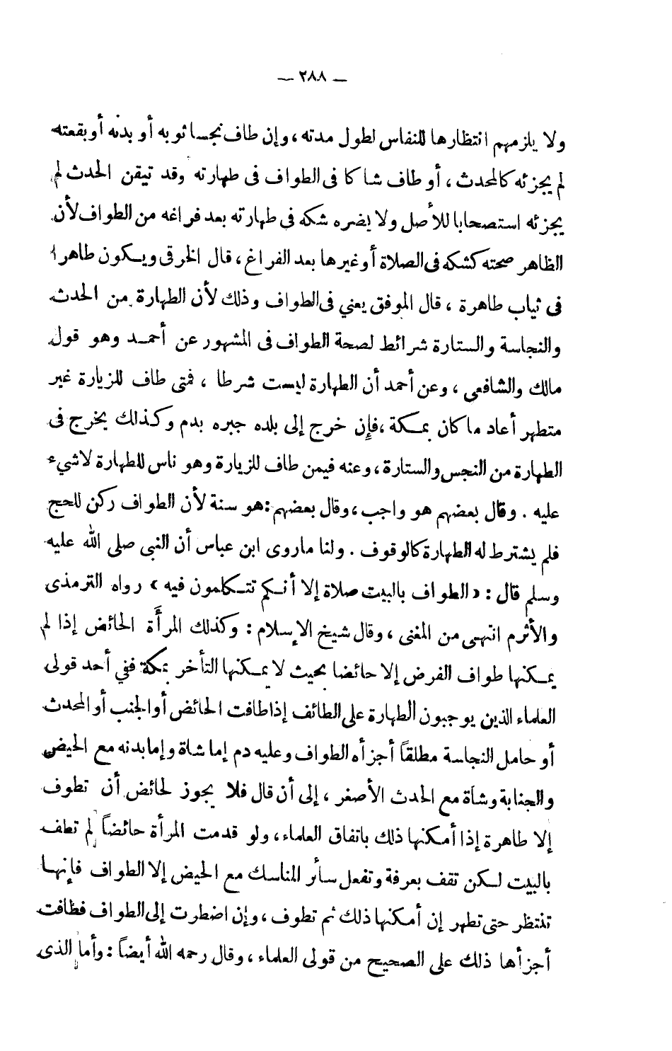 ولا يلزمهم انتظارها للنفاس لطول مدته، وإن طاف نجسا ثوبه أو بدنه أو بقعته لم يجزئه كالمحدث، أو طاف شاكا في الطواف في طهارته وقد تيقن الحدث لم يجزئه استصحاباً للأصل ولا يضره شكه في طهارته بعد فراغه من الطواف لأن الظاهر صحته كشكه في الصلاة أو غيرها بعد الفراغ، قال الخرقي ويكون طاهراً في ثياب طاهرة، قال الموفق يعني في الطواف وذلك لأن الطهارة من الحدث والنجاسة والستارة شرائط لصحة الطواف في المشهور عن أحمد وهو قول مالك والشافعي، وعن أحمد أن الطهارة ليست شرطاً، فمتى طاف للزيارة غير متطهر أعاد ما كان بمكة، فإن خرج إلى بلده جبره بدم وكذلك يخرج في الطهارة من النجس والستارة، وعنه فيمن طاف للزيارة وهو ناس للطهارة لا شيء عليه وقال أبو حنيفة ليس شيء من ذلك شرطاً واختلف أصحابه فقال بعضهم هو واجب، وقال بعضهم: هو سنة لأن الطواف ركن للحج فلم يشترط له الطهارة كالوقوف، ولنا ما روى ابن عباس أن النبي صلى الله عليه وسلم قال: (الطواف بالبيت صلاة إلا أنكم تتكلمون فيه) رواه الترمذي والأثرم انتهى من المغني، وقال شيخ الإسلام: وكذلك المرأة