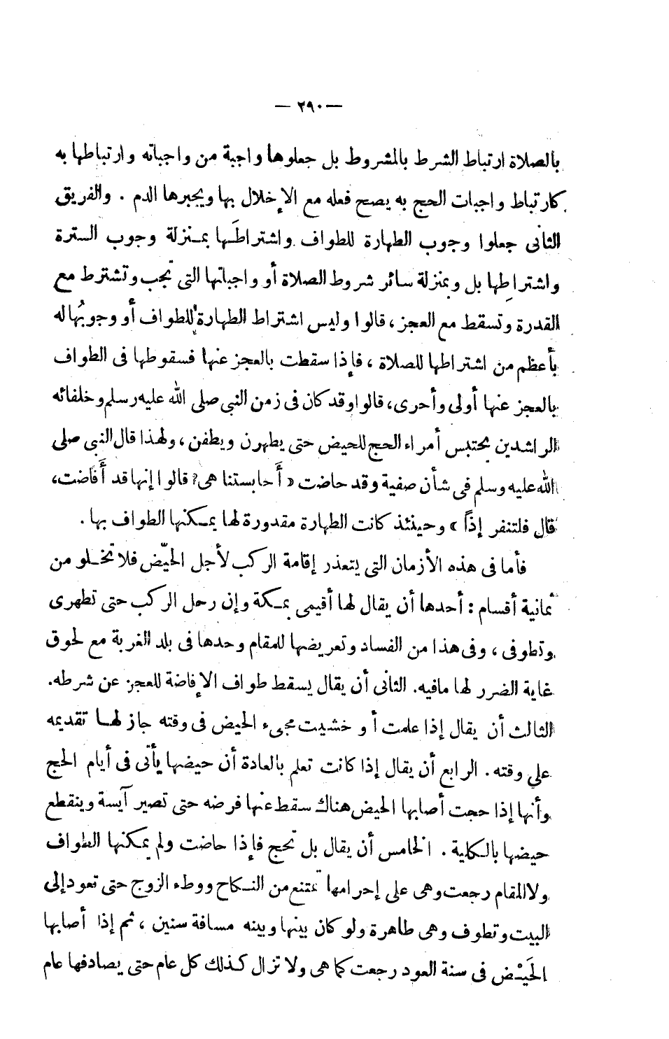 بالصلاة ارتباط الشرط بالمشروط بل جعلوها واجبة من واجباته وارتباطها به كارتباط واجبات الحج به يصح فعله مع الإخلال بها ويجبرها الدم. والفريق الثاني جعلوا وجوب الطهارة للطواف واشتراطها بمنزلة وجوب السترة واشتراطها بل وبمنزلة سائر شروط الصلاة أو واجباتها التي تجب وتشترط مع القدرة وتسقط مع العجز، قالوا وليس اشتراط الطهارة للطواف أو وجوبها له بأعظم من اشتراطها للصلاة، فإذا سقطت بالعجز عنها فسقوطها في الطواف بالعجز عنها أولى وأحرى، قالوا وقد كان في زمن النبي صلى الله عليه وسلم وخلفائه الراشدين يحتبس أمراء الحج للحيض حتى يطهرن ويطفن، ولهذا قال النبي صلى الله عليه وسلم في شأن صفية وقد حاضت: (أحابستنا هي؟ قالوا إنها قد أفاضت، قال فلتنفر إذاً) وحينئذ كانت الطهارة مقدورة لها يمكنها الطواف بها.