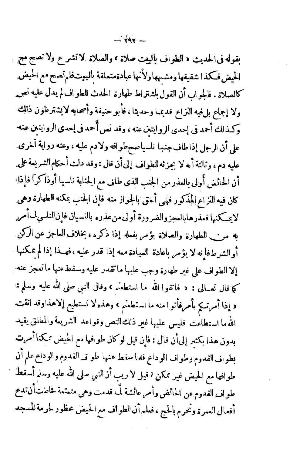 بقوله في الحديث (الطواف بالبيت صلاة) والصلاة لا تشرع ولا تصح مع الحيض فكذا شقيقها ومشبهها ولأنها عبادة متعلقة بالبيت فلم تصح مع الحيض كالصلاة، فالجواب أن يقول باشتراط طهارة الحدث للطواف لم يدل عليه نص ولا إجماع، بل فيه النزاع قديماً وحديثا، فأبو حنيفة وأصحابه لا يشترطون ذلك، وكذلك أحمد في إحدى الروايتين عنه، وقد نص أحمد في إحدى الروايتين عنه على أن الرجل إذا طاف جنباً ناسياً صح طوافه ولا دم عليه، وعنه رواية أخرى عليه دم، وثالثة أنه لا يجزئه الطواف إلى أن قال: وقد دلت أحكام الشريعة على أن الحائض أولى بالعذر من الجنب الذي طاف مع الجنابة ناسياً أو ذاكراً فإذا كان فيه النزاع المذكور فهي أحق بالجواز منه فإن الجنب يمكنه الطهارة وهي لا يمكنها فعذرها بالعجز والضرورة أولى من عذره بالنسيان فإن الناسي لما أمر به من الطهارة والصلاة يؤمر بفعله إذا ذكره، بخلاف العاجز عن الركن أو الشرط فإنه لا يؤمر بإعادة العبادة معه إذا قدر عليه، فهذه إذا لم يمكنها إلا الطواف على غير طهارة وجب عليها ما تقدر عليه وسقط عنها ما تعجز عنه كما قال تعالى: (فاتقوا الله ما استطعتم) وقال النبي صلى الله عليه وسلم (إذا أمرتكم بأمر فأتوا منه ما استطعتم) وهذه لا تستطيع إلا هذا وقد اتقت الله ما استطاعت فليس عليها غير ذلك بالنص وقواعد الشريعة