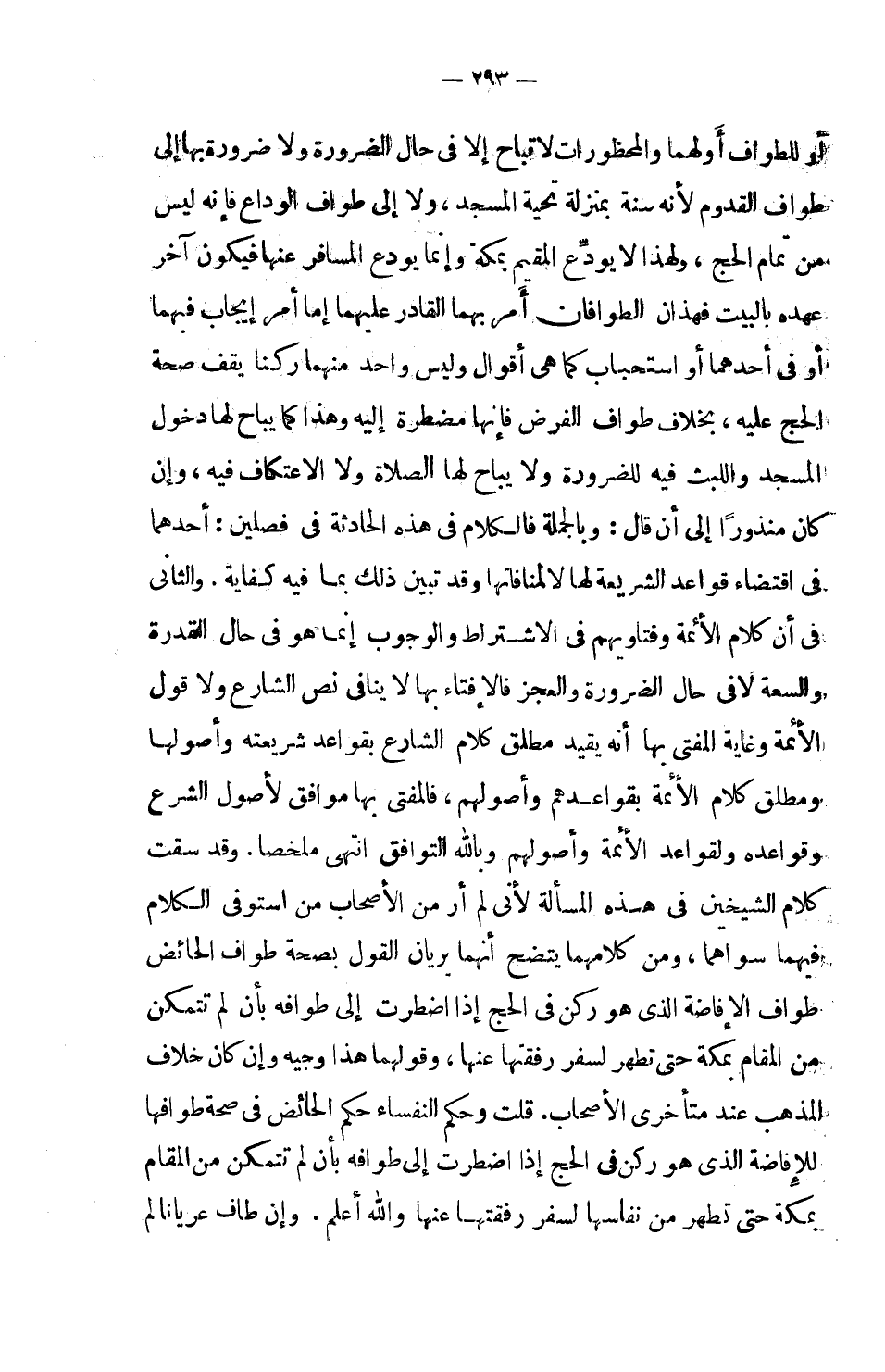 أو للطواف أو لهما والمحظورات لا تباح إلا في حال الضرورة ولا ضرورة بها إلى طواف القدوم لأنه سنة بمنزلة تحية المسجد، ولا إلى طواف الوداع فإنه ليس من تمام الحج، ولهذا لا يودع المقيم بمكة وإنما يودع المسافر عنها فيكون آخر عده بالبيت فهذان الطوافان أمر بهما القادر عليهما إما أمر إيجاب فيهما أو في أحدهما أو استحباب كما هي أقوال وليس واحد منهما ركنا يقف صحة الحج عليه، بخلاف طواف الفرض فإنها مضطرة إليه وهذا كما يباح لها دخول المسجد واللبث فيه للضرورة ولا يباح لها الصلاة ولا الاعتكاف فيه، وإن كان منذوراً إلى أن قال: وبالجملة فالكلام في هذه الحادثة في فصلين: أحدهما في اقتضاء قواعد الشريعة لها لا لمنافاتها وقد تبين ذلك بما فيه كفاية. والثاني في أن كلام الأئمة وفتاويهم في الاشتراط والوجوب إنما هو في حال القدرة والسعة لا في حال الضرورة والعجز فالإفتاء بها لا ينافي نص الشارع ولا قول الأئمة وغاية المفتي بها أنه يقيد مطلق كلام الشارع بقواعد شريعته وأصولها ومطلق كلام الأئمة بقواعدهم وأصولهم، فالمفتي بها موافق لأصول الشرع وقواعده ولقواعد الأئمة وأصولهم وبالله التوفيق انتهى ملخصاً.
