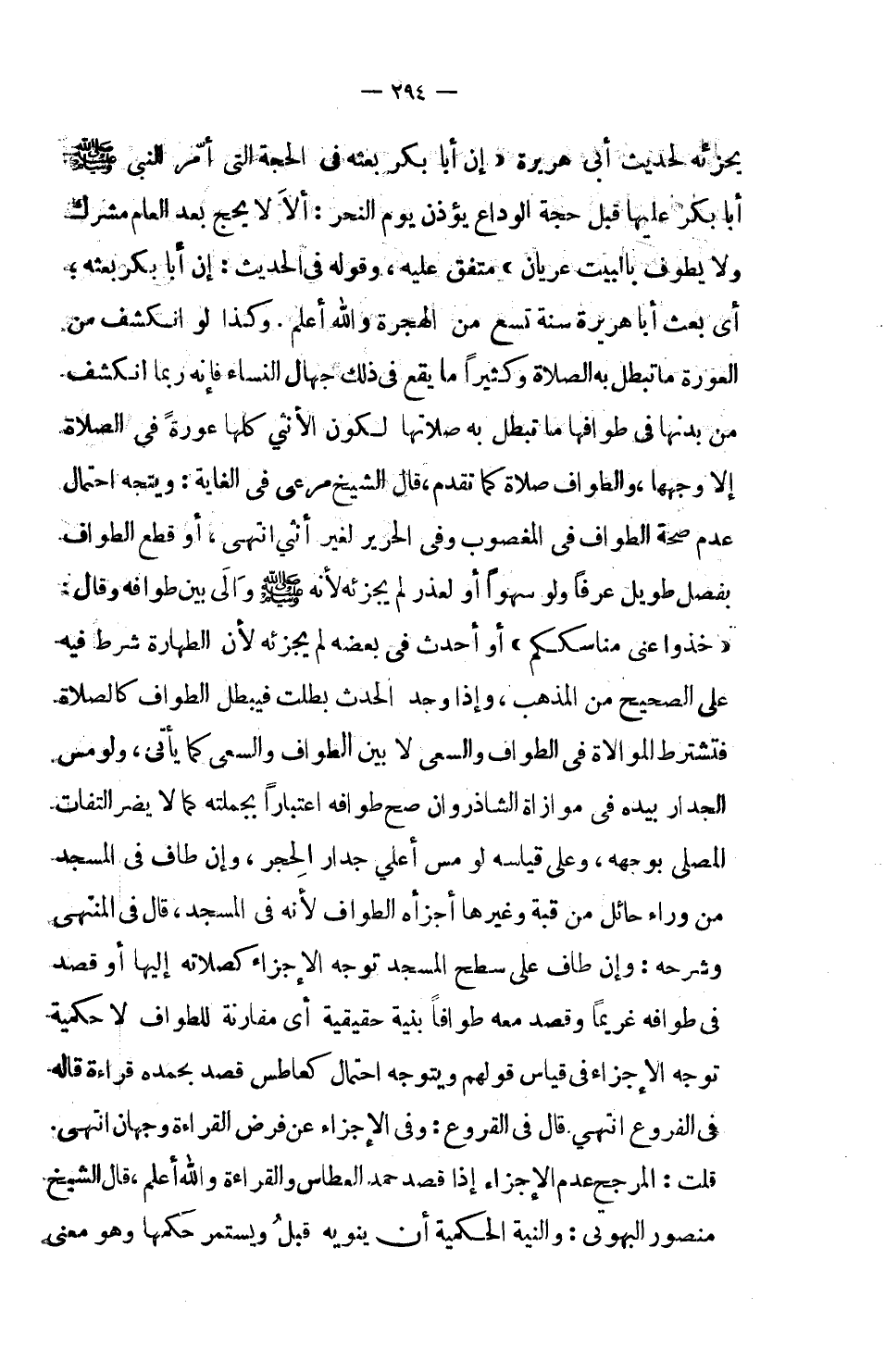 وكذا لو انكشف من العورة ما تبطل به الصلاة وكثيراً ما يقع في ذلك جهال النساء فإنه ربما انكشف من بدنها في طوافها ما تبطل به صلاتها لكون الأنثى كلها عورة في الصلاة إلا وجهها، والطواف صلاة كما تقدم، قال الشيخ مرعي في الغاية: ويتجه احتمال عدم صحة الطواف في المغصوب وفي الحرير لغير أنثى انتهى، أو قطع الطواف بفصل طويل عرفاً ولو سهواً أو لعذر لم يجزئه لأنه صلى الله عليه وسلم والى بين طوافه وقال: (خذوا عني مناسككم) أو أحدث في بعضه لم يجزئه لأن الطهارة شرط فيه على الصحيح من المذهب، وإذا وجد الحدث بطلت فيبطل الطواف كالصلاة فتشترط الموالاة في الطواف والسعي لا بين الطواف والسعي كما يأتي، ولو مس الجدار بيده في موازاة الشاذروان صح طوافه اعتباراً بجملته كما لا يضر التفات المصلي بوجهه، وعلى قياسه لو مس أعلى جدار الحجر، وإن طاف في المسجد من وراء حائل من قبة وغيرها أجزأه الطواف لأنه في المسجد، قال في المنتهى وشرحه: وإن طاف على سطح المسجد توجه الإجزاء كصلاته إليها أو قصد في طوافه غريماً وقصد معه طوافاً بنية حقيقية أي مقارنة للطواف لا حكمية توجه الإجزاء في قياس قولهم ويتوجه احتمال كعاطس قصد بحمده قراءة قاله في الفروع انتهى. قال في الفروع: وفي الإجزاء عن فرض القراءة وجهان انتهى. قلت: المرجح عدم الإجزاء، إذا قصد حمد العطاس والقراءة والله أعلم، قال الشيخ منصور البهوتي: والنية الحكمية أن ينويه قبل ويستمر حكمها وهو معنى