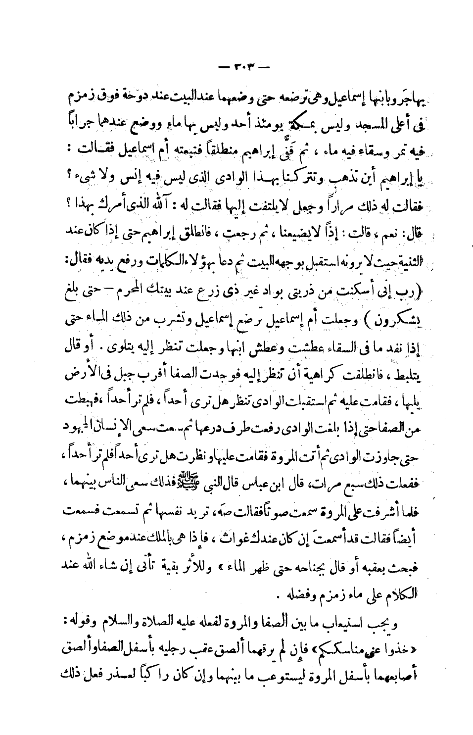 نعم، قالت: إذاً لا يضيعنا، ثم رجعت، فانطلق إبراهيم حتى إذا كان عند الثنية حيث لا يرونه استقبل بوجهه البيت ثم دعا بهؤلاء الكلمات ورفع يديه فقال: (رب إني أسكنت من ذريتي بواد غير ذي زرع عند بيتك الحرام، حتى بلغ يشكرون) وجعلت أم إسماعيل ترضع إسماعيل وتشرب من ذلك الماء حتى إذا نفد ما في السقا عطشت وعطش ابنها وجعلت تنظر إليه يتلوى. أو قال يتلبط، فانطلقت كراهية أن تنظر إليه فوجدت الصفا أقرب جبل في الأرض يليها، فقامت عليه ثم استقبلت الوادي تنظر هل ترى أحداً فلم تر أحداً، فهبطت من الصفا حتى إذا بلغت الوادي رفعت طرف درعها ثم سعت سعي الإنسان المجهود حتى جاوزت الوادي ثم أتت المروة فقامت عليها ونظرت هل ترى أحداً فلم تر أحداً ففعلت ذلك سبع مرات، قال ابن عباس قال النبي صلى الله عليه وسلم فذلك سعى الناس بينهما، فلما أشرفت على المروة سمعت صوتاً فقالت صهَ، تريد نفسها ثم تسمعت فسمعت أيضاً فقالت: قد أسمعت إن كان عندك غواث، فإذا هي بالملك عند موضع زمزم، فبحث بعقبه أو قال بجناحه حتى ظهر الماء) وللأثر بقية تأتي إن شاء الله عند الكلام على ماء زمزم وفضله.