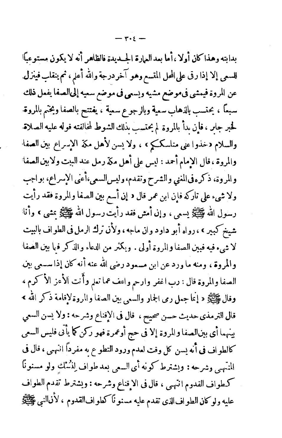بدابته وهذا كان أولاً، أما بعد العمارة الجديدة فالظاهر أنه لا يكون مستوعباً للسعي إلا إذا رقى على المحل المتسع وهو آخر درجة والله أعلم، ثم ينقلب فينزل عن المروة فيمشي في موضع مشيه ويسعى في موضع سعيه إلى الصفا يفعل ذلك سبعاً، يحتسب بالذهاب سعيه والرجوع سعية، يفتتح بالصفا ويختم بالمروة لخبر جابر، فإن بدأ بالمروة لم يحتسب بذلك الشوط لمخالفته قوله عليه الصلاة والسلام (خذوا عني مناسككم) ، ولا يسن لأهل مكة الإسراع بين الصفا والمروة، قال الإمام أحمد: ليس على أهل مكة رمل عند البيت ولا بين الصفا والمروة، ذكره في المغني والشرح وتقدم، وليس السعي، أعني الإسراع، بواجب ولا شيء على تاركه فإن ابن عمر قال: (إن أسع بين الصفا والمروة فقد رأيت رسول الله صلى الله عليه وسلم يسعى، وإن أمش فقد رأيت رسول الله صلى الله عليه وسلم يمشي وأنا شيخ كبير) . رواه أبو داود وابن ماجة، ولأن ترك الرمل في الطواف بالبيت لا شيء فيه فبين الصفا والمروة أولى.