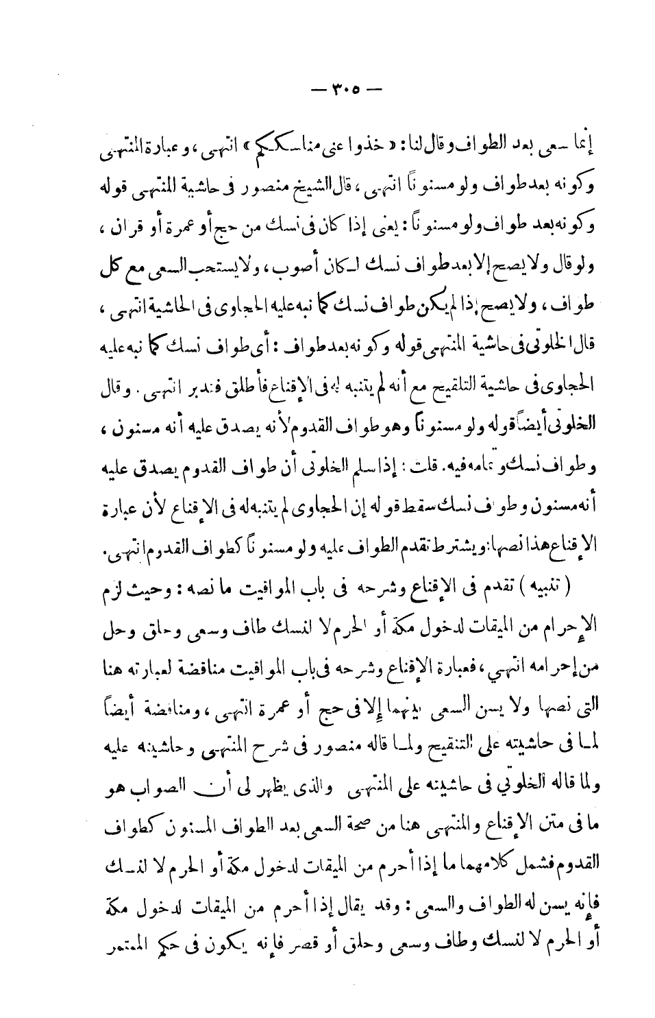 إنما سعى بعد الطواف وقال لنا: (خذوا عني مناسككم) انتهى، وعبارة المنتهى وكونه بعد طواف ولو مسنوناً انتهى. قال الشيخ منصور في حاشية المنتهى قوله وكونه بعد طواف ولو مسنوناً: يعني إذا كان في نسك من حج أو عمرة أو قران، ولو قال ولا يصح إلا بعد طواف نسك لكان أصوب، ولا يستحب السعي مع كل طواف، ولا يصح إذا لم يكن طواف نسك كما نبه عليه الحجاوي في الحاشية انتهى، قال الخلوتي في حاشية المنتهى قوله وكونه بعد طواف: أي طواف نسك كما نبه عليه الحجاوي في حاشية التلقيح مع أنه لم يتنبه له في الإقناع فأطلق فتدبر انتهى. وقال الخلوتي أيضاً قوله ولو مسنوناً وهو طواف القدوم لأنه يصدق عليه أنه مسنون، وطواف نسك وتمامه فيه. قلت: إذا سلم الخلوتي أن طواف القدوم يصدق عليه أنه مسنون وطواف نسك سقط قوله إن الحجاوي لم يتنبه له في الإقناع لأن عبارة الإقناع هذا نصها: ويشترط تقدم الطواف عليه ولو مسنوناً كطواف القدوم. انتهى.