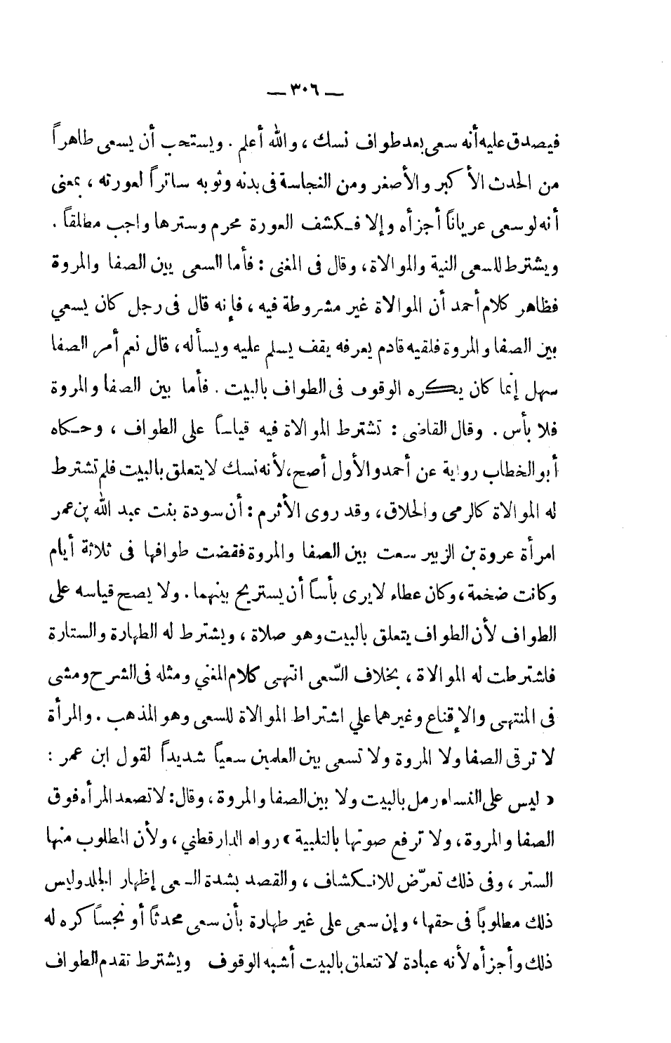 رواه الدارقطني، ولأن المطلوب منها الستر، وفي ذلك تعرّض للانكشاف، والقصد بشدة السعي إظهار الجلد وليس ذلك مطلوباً في حقها، وإن سعى على غير طهارة بأن سعى محدثاً أو نجساً كره له ذلك وأجزأه لأنه عبادة لا تتعلق بالبيت أشبه الوقوف ويشترط تقدم الطواف