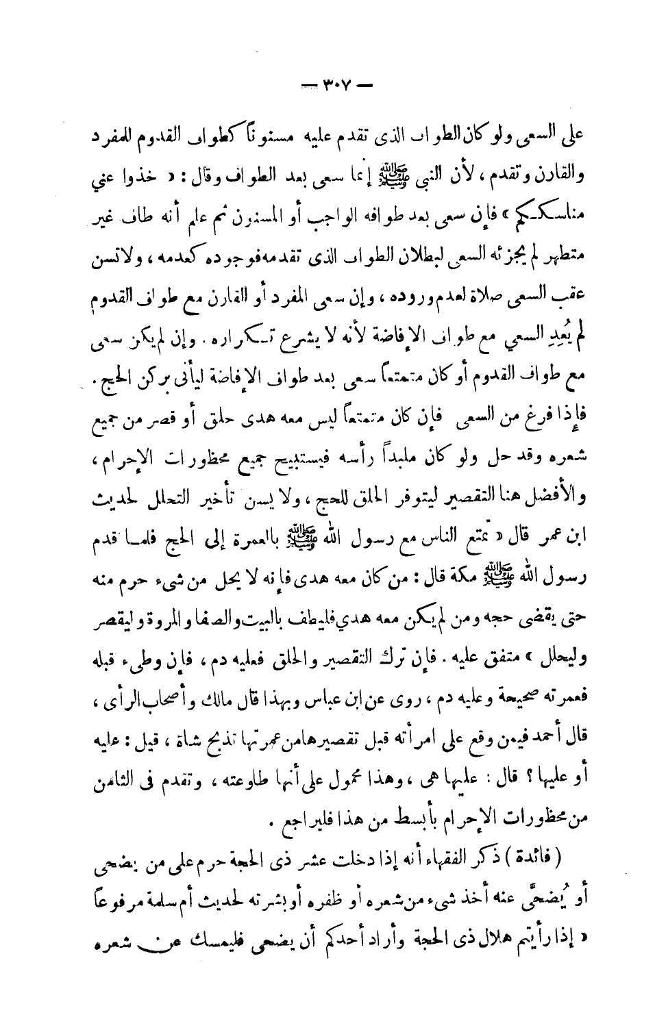 على السعي ولو كان الطواف الذي تقدم عليه مسنوناً كطواف القدوم للمفرد والقارن وتقدم، لأن النبي صلى الله عليه وسلم إنما سعى بعد الطواف وقال: (خذوا عني مناسككم) فإن سعى بعد طوافه الواجب أو المسنون ثم علم أنه طاف غير متطهر لم يجزئه السعي لبطلان الطواف الذي تقدمه فوجوده كعدمه، ولا تسن عقب السعي صلاة لعدم وروده، وإن سعى المفرد أو القارن مع طواف القدوم لم يعد السعي مع طواف الإفاضة لأنه لا يشرع تكراره، وإن لم يكن سعي مع طواف القدوم، أو كان متمتعاً سعى بعد طواف الإفاضة ليأتي بركن الحج، فإذا فرغ من السعي فإن كان متمتعاً ليس معه هدى حلق أو قصر من جميع شعره وقد حل ولو كان ملبداً رأسه فيستبيح جميع محظورات الإحرام، والأفضل هنا التقصير ليتوفر الحلق للحج، ولا يسن تأخير التحلل لحديث ابن عمر قال: (تمتع الناس مع رسول الله صلى الله عليه وسلم بالعمرة إلى الحج فلما قدم رسول الله صلى الله عليه وسلم مكة قال: من كان معه هدى فإنه لا يحل من شيء حرم منه حتى يقضي حجة ومن لم يكن معه هدي فليطف بالبيت والصفا والمروة وليقصر وليحلل) . متفق عليه. فإن ترك التقصير والحلق فعليه دم، فإن وطيء قبله فعمرته صحيحة وعليه دم، روى عن ابن عباس وبهذا قال مالك وأصحاب الرأي، قال أحمد فيمن وقع على امرأته قبل تقصيرها من عمرتها تذبح شاة، قيل: عليه أو عليها؟ قال: عليها هي، وهذا محمول على أنها طاوعته، وتقدم في الثامن من محظورات الإحرام بأبسط من هذا فليراجع.