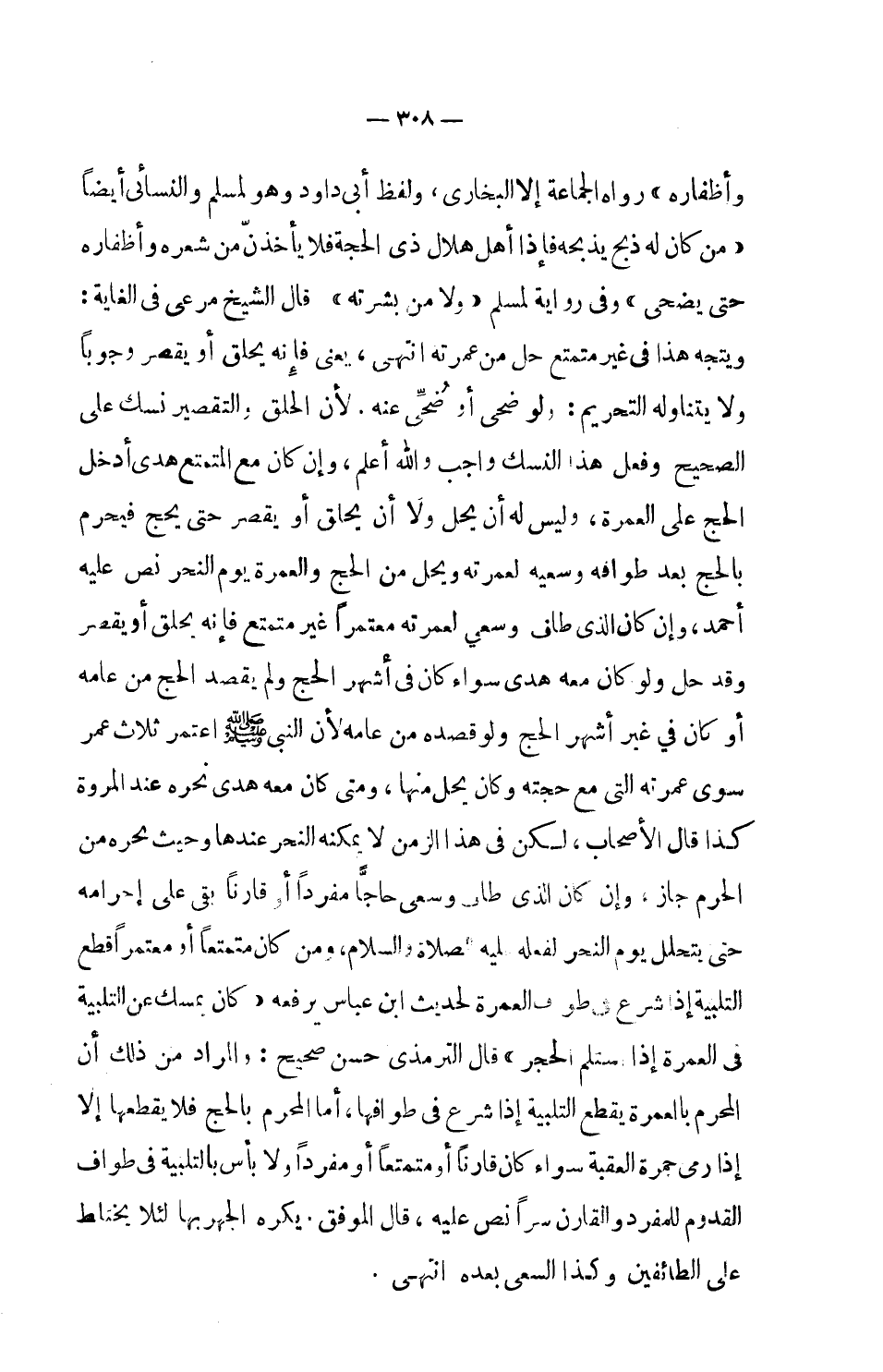 قال الشيخ مرعي في الغاية: ويتجه هذا في غير متمتع حل من عمرته، انتهى، يعني فإنه يحلق أو يقصر وجوباً ولا يتناوله التحريم: ولو ضحى أو ضُحِّي عنه، لأن الحلق والتقصير نسك على الصحيح وفعل هذا النسك واجب والله أعلم، وإن كان مع المتمتع هدي أدخل الحج على العمرة، وليس له أن يحل ولا أن يحلق أو يقصر حتى يحج فيحرم بالحج بعد طوافه وسعيه لعمرته ويحل من الحج والعمرة يوم النحر نص عليه أحمد، وإن كان الذي طاف وسعى لعمرته معتمراً غير متمتع فإنه يحلق أو يقصر وقد حل ولو كان معه هدي سواء كان في أشهر الحج ولم يقصد الحج من عامه أم كان في غير أشهر الحج ولو قصده من عامه لأن النبي صلى الله عليه وسلم اعتمر ثلاث عمر سوى عمرته التي مع حجته وكان يحل منها، ومتى كان معه هدي نحره عند المروة كذا قال الأصحاب، لكن في هذا الزمن لا يمكنه النحر عندها وحيث نحره من الحرم جاز، وإن كان الذي طاف وسعى حاجاً مفرداً أو قارناً بقي على إحرامه حتى يتحلل يوم النحر لفعله عليه الصلاة والسلام، ومن كان متمتعاً أو معتمراً قطع التلبية إذا شرع في طواف العمرة لحديث ابن عباس يرفعه: (كان يمسك عن التلبية في العمرة إذا استلم الحجر) قال الترمذي حسن صحيح: والمراد من ذلك أن المحرم بالعمرة يقطع التلبية إذا شرع في طوافها، أما المحرم بالحج فلا يقطعها إلا إذا رمى جمرة العقبة سواء كان قارناً أم متمتعاً أم مفرداً ولا بأس بالتلبية في طواف القدوم للمفرد والقارن سراً نص عليه، قال الموفق يكره الجهر بها لئلا يختلط على الطائفين وكذا السعي بعده انتهى.