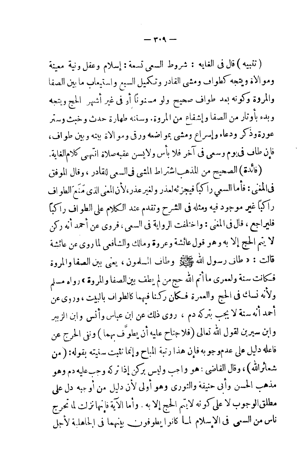 (فائدة) : الصحيح من المذهب اشتراط المشي في السعي للقادر، وقال الموفق في المغني: فأما السعي راكباً فيجزئه لعذر ولغير عذر، لأن المعنى الذي منع الطواف راكباً غير موجود فيه ومثله في الشرح وتقدم عند الكلام على الطواف راكباً فليراجع، قال في المغني: واختلفت الرواية في السعي، فروى عن أحمد أنه ركن لا يتم الحج إلا به وهو قول عائشة وعروة ومالك والشافعي لما روى عن عائشة قالت: (طاف رسول الله صلى الله عليه وسلم وطاف المسلمون، يعني بين الصفا والمروة فكانت سنة ولعمري ما أتم الله حج من لم يطف بين الصفا والمروة) رواه مسلم. ولأنه نسك في الحج والعمرة فكان ركنا فيهما كالطواف بالبيت، وروى عن أحمد أنه سنة لا يجب بتركه دم، روى ذلك عن ابن عباس وأنس وابن الزبير وابن سيرين لقول الله تعالى: (فلا جناح عليه أن يطوف بهما) ونفى الحرج عن فاعله دليل على عدم وجوبه فإن هذا رتبة المباح وإنما تثبت سنيته بقوله: (من شعائر الله) ، وقال القاضي: هو واجب وليس بركن إذا تركه وجب عليه دم وهو مذهب الحسن وأبي حنيفة والثوري وهو أولى لأن دليل من أوجبه دل على مطلق الوجوب لا على كونه لا يتم الحج إلا به.