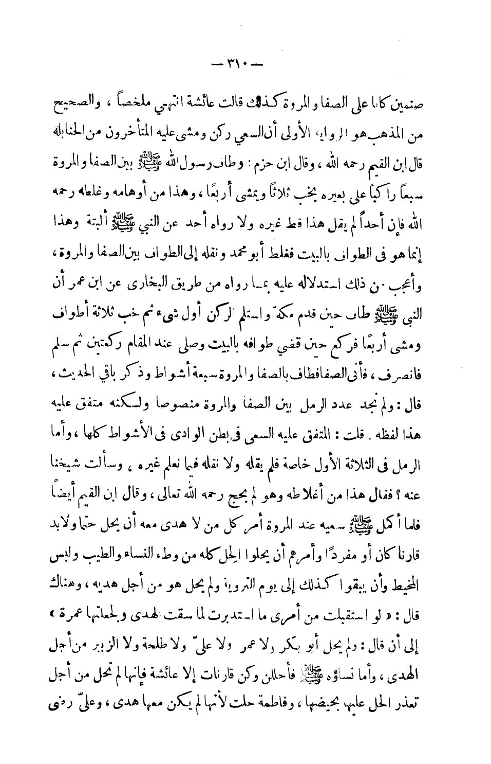 قلت: المتفق عليه السعي في بطن الوادي في الأشواط كلها، وأما الرمل في الثلاثة الأول خاصة فلم يقله ولا نقله فيما نعلم غيره، وسألت شيخنا عنه؟ فقال هذا من أغلاطه وهو لم يحج رحمه الله تعالى، وقال ابن القيم أيضاً فلما أكمل صلى الله عليه وسلم سعيه عند المروة أمر كل من لا هدي معه أن يحل حتما ولا بد قارناً كان أو مفرداً وأمرهم أن يحلوا الحل كله من وطء النساء والطيب ولبس المخيط وأن يبقوا كذلك إلى يوم التروية ولم يحل هو من أجل هديه، وهناك قال: (لو استقبلت من أمري ما استدبرت لما سقت الهدي ولجعلتها عمرة) إلى أن قال: ولم يحل أبو بكر ولا عمر ولا علي ولا طلحة ولا الزبير من أجل الهدي، وأما نساؤه صلى الله عليه وسلم فأحللن وكن قارنات إلا عائشة فإنها لم تحل من أجل تعذر الحل عليها بحيضها، وفاطمة حلت لأنها لم يكن معها هدي وعلي رضي