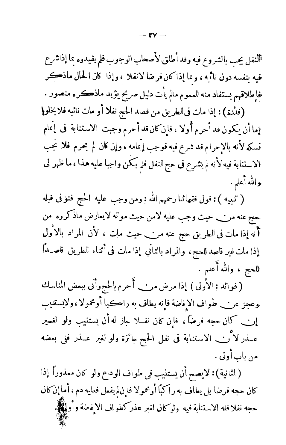 فائدة: إذا مات في الطريق من قصد الحج نفلا أو مات نائبه فلا يخلو إما أن يكون قد أحرم أولا، فإن كان قد أحرم وجبت الاستنبابة في إتمام نسكه لأنه بالإحرام قد شرع فيه فوجب إتمامه، وإن كان لم يحرم فلا تجب الاستنابة فيه لأنه لم يشرع في حج النفل فلم يكن واجباً عليه، هذا ما ظهر لي والله أعلم.