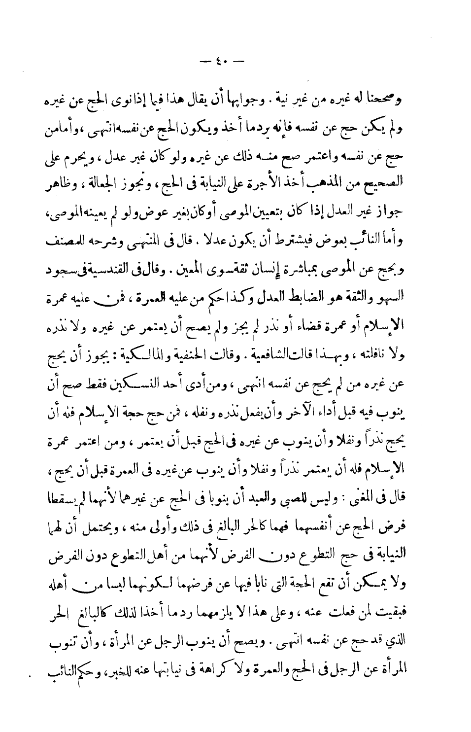 ومن أدى أحد النسكين فقط صح أن ينوب فيه قبل أداء الآخر وأن يفعل نذره ونفله، فمن حج حجة الإسلام فله أن يحج نذراً ونفلا وأن ينوب عن غيره في الحج قبل أن يعتمر، ومن اعتمر عمرة الإسلام فله أن يعتمر نذراً ونفلا وأن ينوب عن غيره في العمر قبل أن يحج، قال في المغني: وليس للصبي وللعبد أن ينوبا في الحج عن غيرهما لأنهما لم يسقطا فرض الحج عن أنفسهما فهما كالحر البالغ في ذلك وأولى منه، ويحتمل أن لهما النيابة في حج التطوع دون لا فرض لأنهما من أهل التطوع دون الفرض ولا يمكن أن تقع الحجة التي نابا فيها عن فرضهما، لكونهما ليسا من أهله فبقيت لمن فعلت عنه، وعلى هذا لا يلزمهما رد ما أخذا لذلك كالبالغ الحر الذي قد حج عن نفسه انتهى، ويصح أن ينوب الرجل عن المرأة، وأن تنوب المرأة عن الرجل في الحج والعمرة ولا كراهة في نيابتها عنه للخبر.