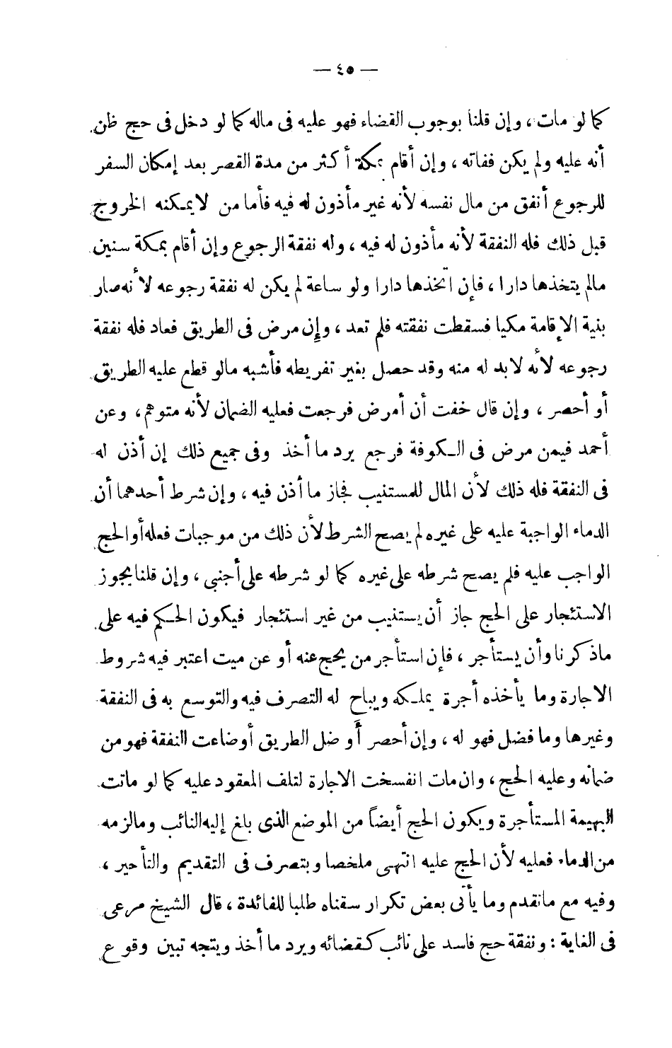 الكوفة فرجع يرد ما أخذ وفي جميع ذلك إن أذن له في النفقة فله ذلك لأن المال للمستنيب فجاز ما أذن فيه، وإن شرط أحدهما أن الدماء الواجبة عليه على غيره لم يصح الشرط؛ لأن ذلك من موجبات فعله أو الحج الواجب عليه فلم يصح شرطه على غيره كما لو شرطه على أجنبي، وإن قلنا يجوز الاستئجار على الحج جاز أن يستنيب من غير استئجار فيكون الحكم فيه على ما ذكرنا وأن يستأجر، فإن استأجر من يحج عنه أو عن ميت اعتبر فيه شروط الإجارة وما يأخذه أجرة يملكه ويباح له التصرف فيه والتوسع به في النفقة وغيرها وما فضل فهو له، وإن أحصر أو ضل الطريق أو ضاعت النفقة فهو من ضمانه وعليه الحج، وإن مات انفسخت الإجارة لتلف المعقود عليه كما لو ماتت البهيمة المستأجرة ويكون الحج أيضاً من الموضع الذي بلغ إليه النائب وما لزمه من الدماء فعليه لأن الحج عليه انتهى ملخصا وبتصرف في التقديم والتأخير، وفيه مع ما تقدم وما يأتي بعض تكرار سقناه طلباً للفائدة، قال الشيخ مرعي في الغاية: ونفقة حج فاسد على نائب كقضائه ويرد ما أخذ ويتجه تبين وقوع