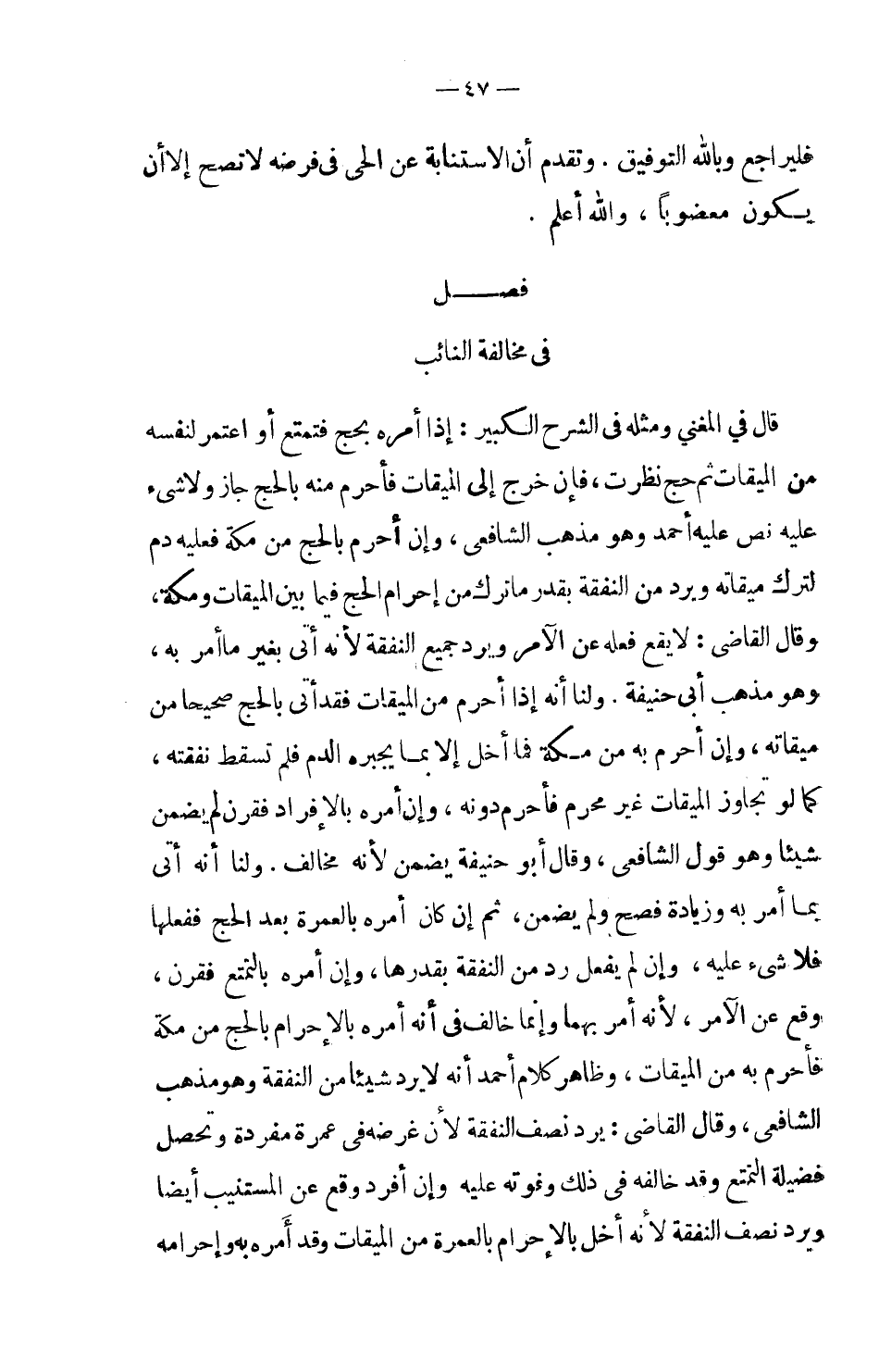 قال في المغني ومثله في الشرح الكبير: إذا أمره بحج فتمتع أو اعتمر لنفسه من الميقات ثم حج نظرت، فإن خرج إلى الميقات فأحرم منه بالحج جاز ولا شيء عليه نص عليه أحمد وهو مذهب الشافعي، وإن أحرم بالحج من مكة فعليه دم لترك ميقاته ويرد من النفقة بقدر ما ترك من إحرام الحج فيما بين الميقات ومكنة، وقال القاضي: لا يقع فعله عن الآمر ويرد جميع النفقة لأنه أتى بغير ما أمر به، وهو مذهب أبي حنيفة، ولنا أنه إذا أحرم من الميقات فقد أتى بالحج صحيحاً من ميقاته، وإن أحرم به من مكة فما أخل إلا بما يجبره الدم فلم تسقط نفقته، كما لو تجاوز الميقات غير محرم فأحرم دونه، وإن أمره بالإفراد فقرن لم يضمن شيئاً وهو قول الشافعي، وقال أبو حنيفة يضمن لأنه مخالف، ولنا أنه أتى بما أمر به وزيادة فصح ولم يضمن، ثم إن كان أمره بالعمرة بعد الحج ففعلها فلا شيء عليه، وإن لم يفعل رد من النفقة بقدرها، وإن أمره بالتمتع فقرن، وقع عن الآمر، لأنه أمر بهما وإنما خالف في أنه أمره بالإحرام بالحج من مكة فأحرم به من الميقات، وظاهر كلام أحمد أنه لا يرد شيئاً من النفقة وهو مذهب الشافعي، وقال القاضي: يرد نصف النفقة لأن غرضه في عمره مفردة وتحصيل فضيلة التمتع وقد خالفه في ذلك وفوته عليه وإن أفراد وقع عن المستنيب أيضاً ويرد نصف النفقة لأنه أخل بالإحرام بالعمرة من الميقات وقد أمره به وإحرامه