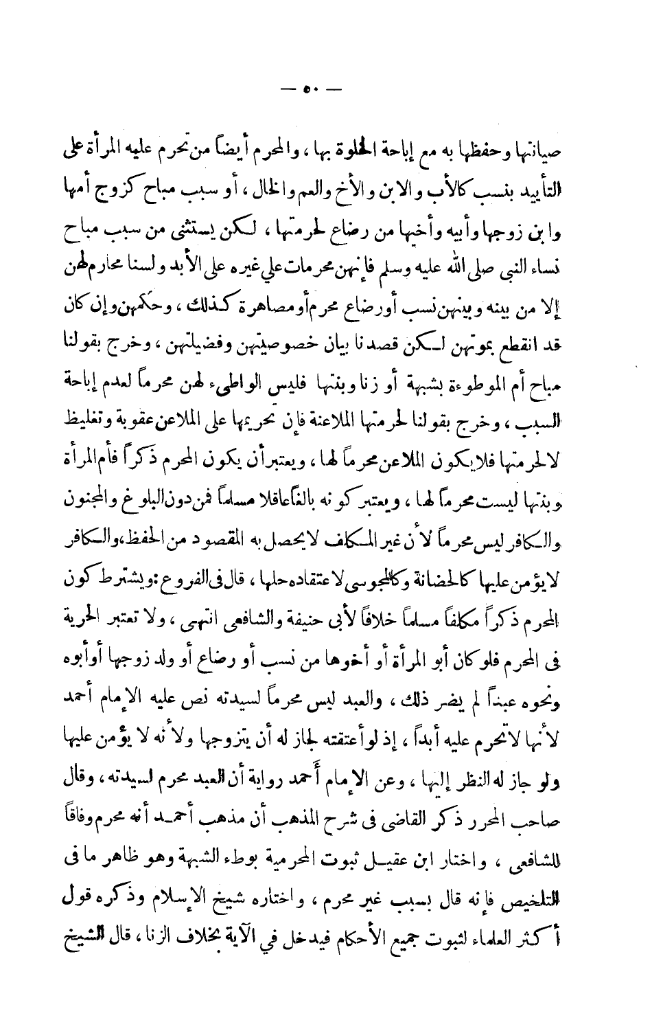 صيانتها وحفظها به مع إباحة الخلوة بها، والمحرم أيضاً من تحرم عليه المرأة على التأبيد بنسب كالأب والابن والأخ والعم والخال، أو سبب مباح كزوج أمها وابن زوجها وأبيه وأخيها من رضاع لحرمتها، لكن يستثنى من سبب مباح نساء النبي صلى الله عليه وسلم فإنهن محمرات على غيره على الأبد ولسنا محارم لهن إلا من بينه وبينهن نسب أو رضاع محرم أو مصاهرة كذلك، وحكمهن وإن كان قد انقطع بموتهن لكن قصدنا بيان خصوصيتهن وفضيلتهن، وخرج بقولنا مباح أم الموطوءة بشبهة أو زنا وبنتها فليس الواطئ لهن محرماً لعدم إباحة السبب، وخرج بقولنا لحرمتها الملاعنة فإن تحريمها على الملاعن عقوبة وتغليظ لا لحرمتها فلا يكون الملاعن محرماً لها، ويعتبر أن يكون المحرم ذكراً فأم المرأة وبنتها ليستا محرماً لها، ويعتبر كونه بالغاً عاقلاً مسلماً فمن دون البلوغ والمجنون والكافر ليس محرماً لأن غير المكلف لا يحصل به المقصود من الحفظ، والكافر لا يؤمن عليها كالحضانة وكالمجوسي لاعتقاده حلها، قال في الفروع: ويشترط كن المحرم ذكراً مكلفاً مسلماً خلافاً لأبي حنيفة والشافعي انتهى، ولا تعتبر الحرية في المحرم فلو كان أبو المرأة أو أخوها من نسب أو رضاع أو ولد زوجها أو أبوه ونحوه عبداً لم يضر ذلك، والعبد ليس محرماً لسيدته نص عليه الإمام أحمد لأنها لا تحرم عليه أبداً، إذ لو أعتقته لجاز له أن يتزوجها ولأنه لا يؤمن عليها ولو جاز له النظر إليها، وعن الإمام أحمد رواية أن العبد محرم لسيدته، وقال صاحب المحرر ذكر القاضي في شرح المذهب أن مذهب أحمد أنه محرما وفقاً للشافعي، واختار