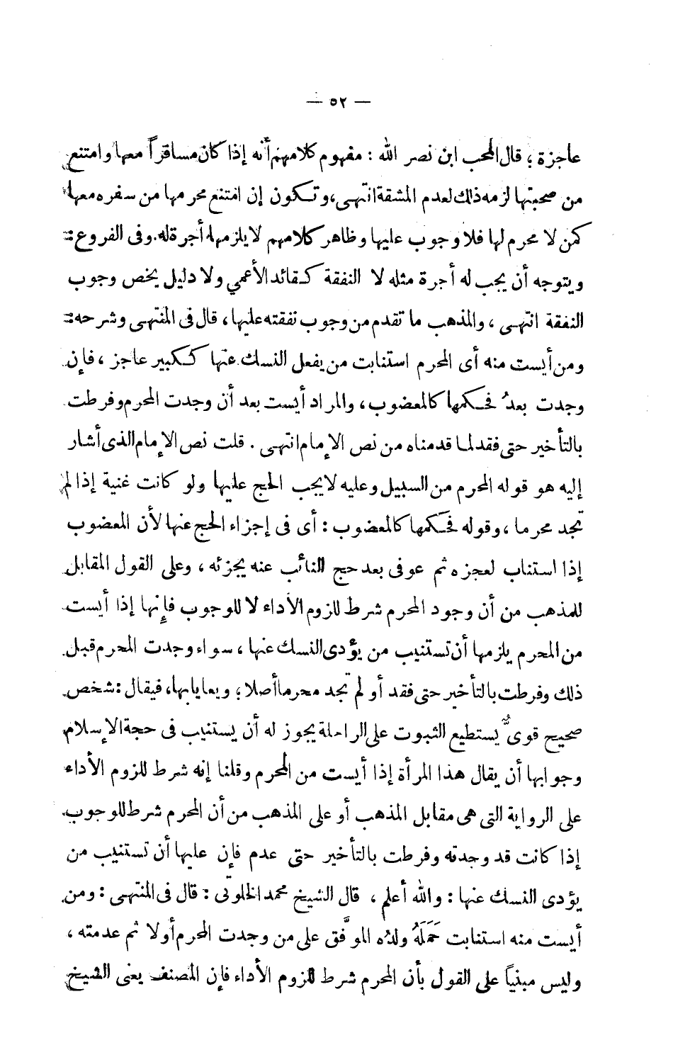 قلت نص الإمام الذي أشار إليه هو قوله المحرم من السبيل وعليه ولا يجب الحج عليها ولو كانت غنية إذا لم تجد محرماً، وقوله فحكمها كالمعضوب: أي في إجزاء الحج عنها لأن المعضوب إذا استناب لعجزه ثم عوفى بعد حج النائب عنه يجزئه، وعلى القول المقابل للمذهب منن أن وجود المحرم شرط للزوم الأداء لا للوجوب فإنها إذا أيست من المحرم يلزمها أن تستنيب من يؤدي النسك عنها، سواء وجدت المحرم قبل ذلك وفرطت بالتأخير حتى فقد أو لم تجد محرماً أصلاً، ويعايا بها، فيقال: شخص صحيح قوي يستطيع الثبوت على الراحلة يجوز له أن يستنيب في حجة الإسلام، وجوابها أن يقال هذا في المرأة إذا أيست من المحرم، وقلنا إنه شرط للزوم الأداء على الرواية التي هي مقابل المذهب أو على المذهب من أن المحرم شرط للوجوب إذا كانت قد وجدته وفرطت بالتأخير حتى عدم، فإن عليها أن تستنيب من يؤدي النسك عنها، والله أعلم.