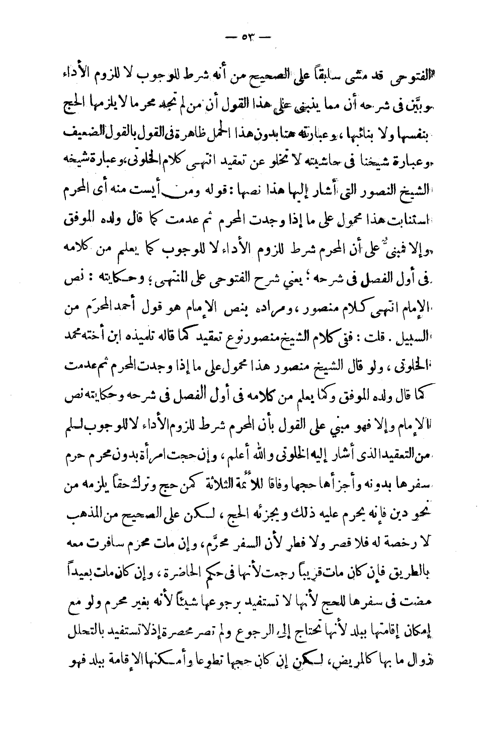 الفتوحي قد مشى سابقا على الصحيح من أنه شرط للوجوب لا للزوم الأداء وبيَّن في شرحه أن مما ينبني على هذا القول أن من لم تجد محرماً لا يلزمها الحج بنفسها ولا بنائبها، وعبارته هنا بدون هذا الحمل ظاهرة في القول بالقول الضعيف وعبارة شيخنا في حاشيته لا تخلو عن تعقيد انتهى كلام الخلوتي، وعبارة شيخه الشيخ منصور التي أشار إليها هذا نصها: قوله ومن أيست منه أي المحرم استنابت، هذا محمول على ما إذا وجدت المحرم ثم عدمت كما قال ولده الموفق، وإلا فمبني على أن المحرم شرط للزوم الأداء لا للوجوب كما يعلم من كلامه في أول الفصل في شرحه يعني شرح الفتوحي على المنتهى؛ وحكايته: نص الإمام انتهى كلام منصور، ومراده بنص الإمام هو قول أحمد المحرم من السبيل. قلت: ففي كلام الشيخ منصور نوع تعقيد كما قاله تلميذه ابن أخته محمد الخلوتي، ولو قال الشيخ منصور هذا محمول على ما إذا وجدت المحرم ثم عدمت، كما قال ولده الموفق، وكما يعلم من كلامه في أول الفصل في شرحه وحكايته نص الإمام، وإلا فهو مبني على القول بأن المحرم شرط للزوم الأداء لا للواجب، لسلم من التعقيد الذي أشار إليه الخلوتي والله أعلم.