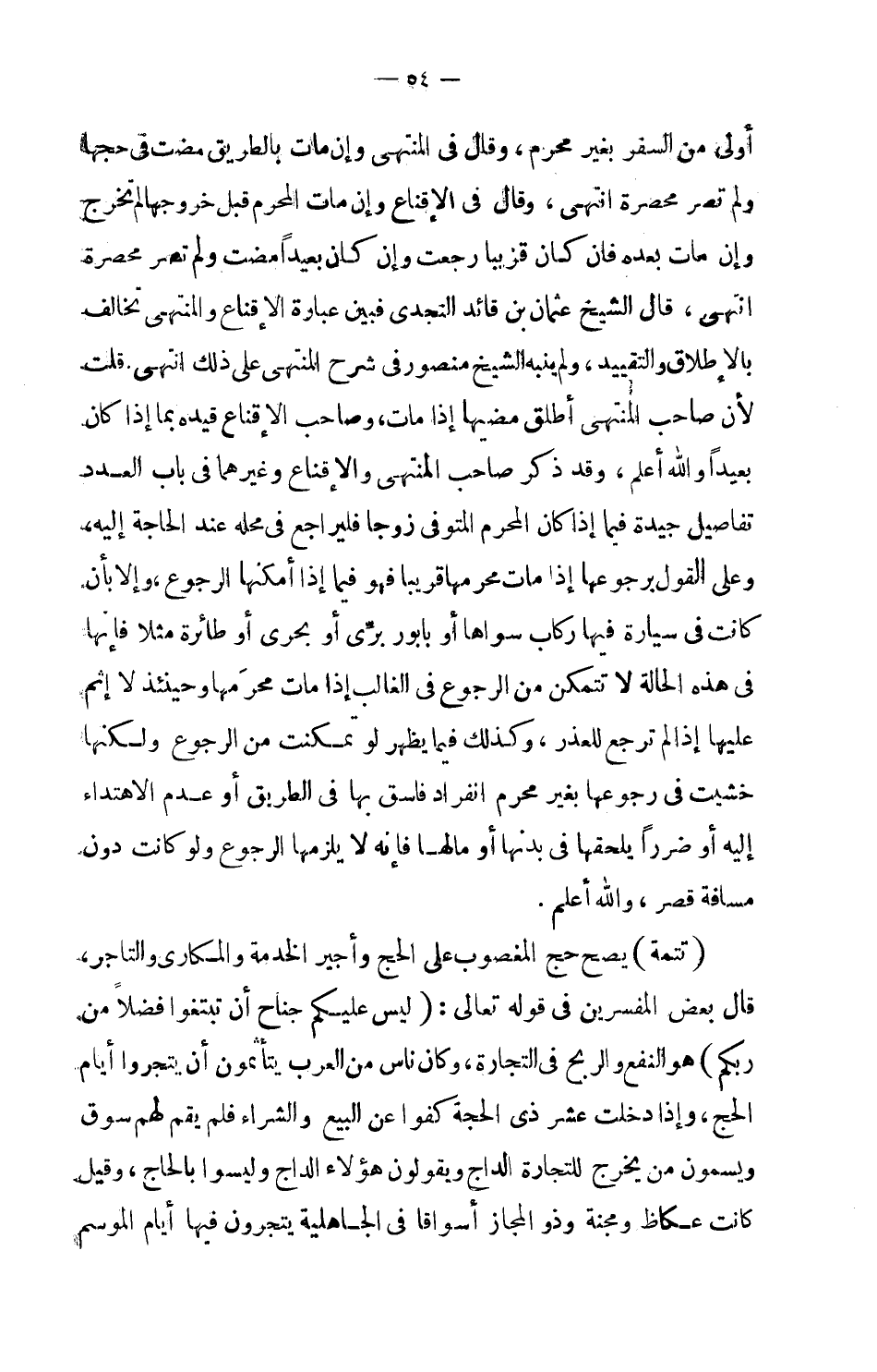 أولى من السفر بغير محرم، وقال في المنتهى: وإن مات بالطريق مضت في حجها ولم تصر محصرة انتهى، وقال في الإقناع وإن مات المحرم قبل خروجها لم تخرج، وإن مات بعده، فإن كان قريباً رجعت، وإن كان بعيداً مضت ولم تصر محصرة انتهى، قال الشيخ عثمان بن قائد النجدي: فبين عبارة الإقناع والمنتهى تخالف بالإطلاق والتقييد، ولم ينبه الشيخ منصور في شرح المنتهى على ذلك انتهى. قلت لأن صاحب المنتهى أطلق مضيها إذا مات، وصاحب الإقناع قيده بما إذا كان بعيداً والله أعلم، وقد ذكر صاحب المنتهى والإقناع وغيرهما في باب العدد تفاصيل جيدة فيما إذا كان المحرم المتوفى زوجاً فليراجع في محله عند الحاجة إليه، وعلى القول برجوعها إذا مات محرمها قريباً فهو فيما إذا أمكنها الرجوع، وإلا بأن كانت في سيارة فيها ركاب سواها أو بابور بري أو بحري أو طائرة مثلاً، فإنها في هذه الحالة لا تتمكن من الرجوع في الغالب إذا مات محرمها، وحينئذ لا إثم عليها إذا لم ترجع للعذر، وكذلك فيما يظهر لو تمكنت من الرجوع، ولكنها خشيت في رجوعها بغير محرم انفراد فاسق بها في الطريق أو عدم الاهتداء إليه أو ضرراً يلحقها في بدنها أو مالها، فإنه لا يلزمها الرجوع ولو كانت دون مسافة قصر، والله أعلم.