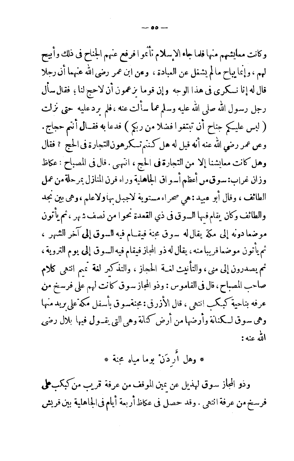 وعن عمر رضي الله عنه أنه قيل له هل كنتم تكرهون التجارة في الحج؟ فقال وهل كنت معايشنا إلا من التجارة في الحج. انتهى. قال في المصباح: عكاظ وزان غراب: سوق من أعظم أسواق الجاهلية وراء قرن المنازل بمرحلة من عمل الطائف، وقال أبو عبيد: هي صحراء مستوية لا جبل بها ولا علم، وهي بين نجد والطائف وكان يقام فيها السوق في ذي القعدة نحوا من نصف شهر، ثم يأتون موضعاً دونه إلى مكة يقال له سوق مجنة فيقام فيه السوق إلى آخر الشهر، ثم يأتون موضعاً قريباً منهن يقال له ذو المجاز فيقام فيه السوق إلى يوم التروية، ثم يصدرون إلى منى، والتأنيث لغة الحجاز، والتذكير لغة تميم انتهى كلام صاحب المصباح، قال في القاموس: وذو المجاز سوق كانت لهم على فرسخ من عرفة بناحية كبكب انتهى. قال الأزرقي: مجنة سوق بأسفل مكة على بريد منها وهي سوق لكنانة وأرضها من أرض كنانة وهي التي يقول فيها بلال رضي الله عنه.