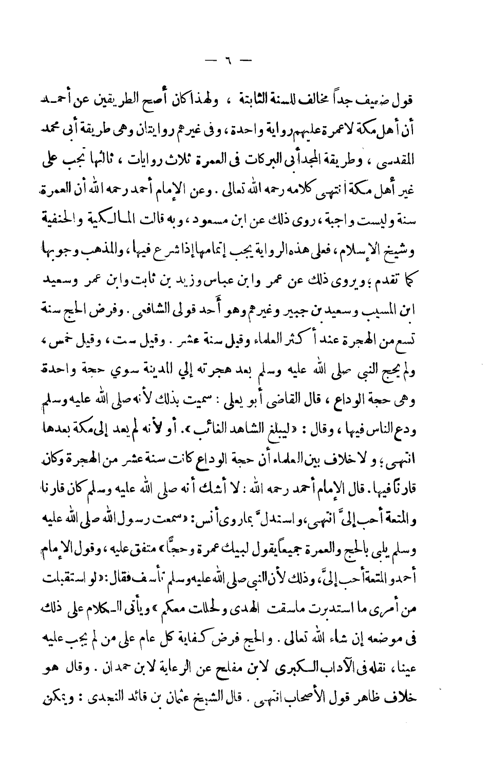 وعن الإمام أحمد رحمه الله أن العمرة سنة وليست واجبة، روى ذلك عن ابن مسعود، وبه قالت المالكية والحنفية وشيخ الإسلام، فعلى هذه الرواية يجب إتمامها إذا شرع فيها، والمذهب وجوبها كما تقدم؛ ويروى ذلك عن عمر وابن عباس وزيد بن ثابت وابن عمر وسعيد بن المسيب وسعيد بن جبير وغيره وهو أحد قولي الشافعي.