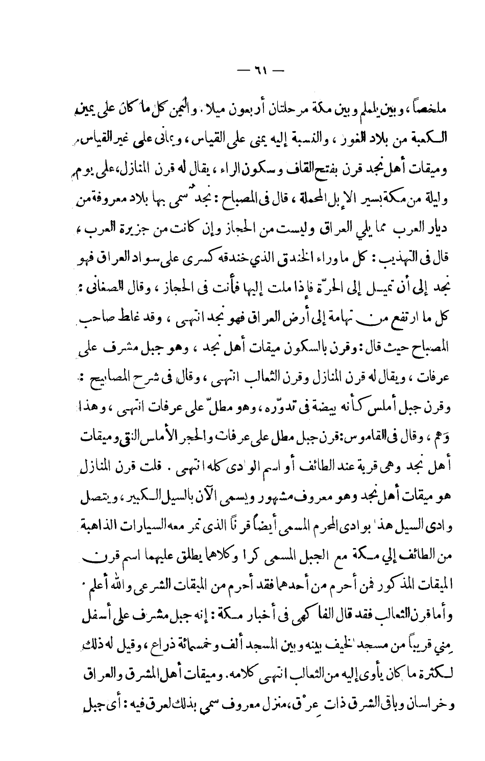 ملخصا، وبين يلملم وبين مكة مرحلتان أربعون ميلاً. واليمن كل ما كان على يمين الكعبة من بلاد الغور، والنسبة إليه يمني على القياس، ويماني على غير القياس. وميقات أهل نجد قرن بفتح القاف وسكون الراء، يقال له قرن المنازل، على يوم وليلة من مكة بسير الإبل المحملة، قال في المصبح: نجد سمي بها بلاد معروفة من ديار العرب مما يلي العراق وليست من الحجاز وإن كانت من جزيرة العرب، قال في التهذيب: كل ما وراء الخندق الذي خندقه كسرى على سواد العراق فهو نجد إلى أن تميل إلى الحرة، فإذا ملت إليها فأنت في الحجاز، وقال الصنعاني: كل ما ارتفع من تهامة إلى أرض العراق فهو نجد انتهى، وقد غلط صاحب المصباح حيث قال: وقرن بالسكون ميقات أهل نجد، وهو جبل مشرف على عرفات، ويقال له قرن المنازل وقرن الثعالب انتهى. وقال في شرح المصابيح: وقرن جبل أملس كأنه بيضة في تدوره، وهو مطل على عرفات انتهى، وهذا وَهم، وقال في القاموس: قرن جبل مطل على عرفات والحجر الأملس النقي وميقات أهل نجد وهي قرية عند الطائف أو اسم الوادي كله انتهى. قلت قرن المنازل هو ميقات أهل نجد وهو معروف مشهور ويسمى الآن بالسيل الكبير، ويتصل وادي السيل هذا بوادي المحرم المسمى أيضاً قرناً الذي تمر معه السيارات الذاهبة من الطائف إلى مكة مع الجبل المسمى كرا، وكالهما يطلق عليهما اسم قرن الميقات المذكور فمن أحرم من أحدهما فقد أحرم من الميقات الشرعي والله أعلم.