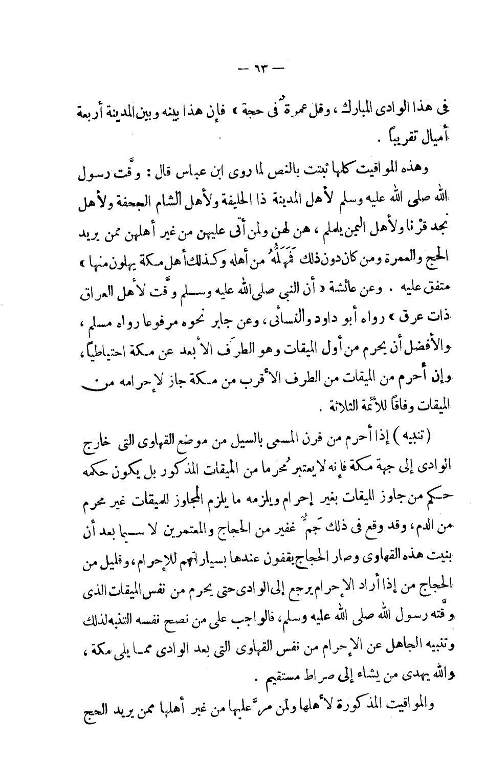 (تنبيه) : إذا أحرم من قرن المسمى بالسيل من موضع القهاوي التي خارج الوادي إلى جهة مكة فإنه لا يعتبر محرماً من الميقات المذكور، بل يكون حكمه حكم من جاوز الميقات بغير إحرام، ويلزمه ما يلزم المجاوز للميقات غير محرم من الدم، وقد وقع في ذلك جم غفير من الحجاج والمعتمرين لا سيما بعد أن بينت هذه القهاوي وصار الحجاج يقفون عندها بسياراتهم للإحرام، وقليل من الحجاج من إذا أراد الإحرام يرجع إلى الوادي حتى يحرم من نفس الميقات الذي وقته رسول الله صلى الله عليه وسلم، فالواجب على من نصح نفسه التنبه لذلك وتنبيه الجاهل عن الإحرام من نفس القهاوي التي بعد الوادي مما يلي مكة، والله يهدي من يشاء إلى صراط مستقيم.