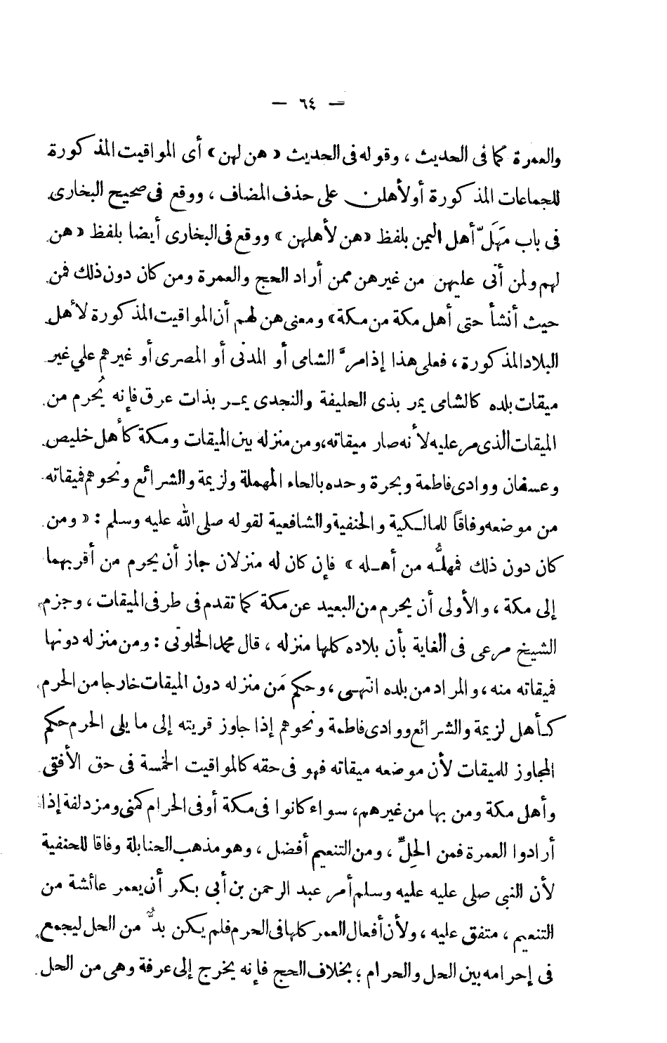 والعمرة كما في الحديث، وقوله في الحديث (هن لهن) أي المواقيت المذكورة للجماعات المذكورة أو لأهلن على حذف المضاف، ووقع في صحيح البخاري في باب مَهَل أهل اليمن بلفظ (هن لأهلهن) ووقع في البخاري أيضاً بلفظ (هن لهم ولمن أتى عليهن من غيرهن ممن أراد الحج والعمر ومن كان دون ذلك فمن حيث أنشأ حتى أهل مكة من مكة) ومعنى هن لهم أن المواقيت المذكورة لأهل البلاد المذكورة، فعلى هذا إذا مر الشامي أو المدني أو المصري أو غيرهم على غير ميقات بلده كالشامي يمر بذي الحليفة والنجدي يمر بذات عرق فإنه يحرم من الميقات الذي مر عليه لأنه صار ميقاته، ومن منزله بين الميقات ومكة كأهل خليص وعسفان ووادي فاطمة وبحرة وحده بالحاء المهملة ولزيمة والشرائع ونحوهم فميقاته من موضعه وفاقاً للمالكية والحنفية والشافعية لقوله صلى الله عليه وسلم: (ومن كان دون ذلك فمهله من أهله) فإن كان له منزلان جاز أن يحرم من أقربهما إلى مكة، والأولى أن يحرم من البعيد عن مكة كما تقدم في طرفي الميقات، وجزم الشيخ مرعي في الغاية بأن بلاده كلها منزله، قال محمد الخلوتي: ومن منزله دونها فيمقاته منه، والمراد من بلده انتهى.