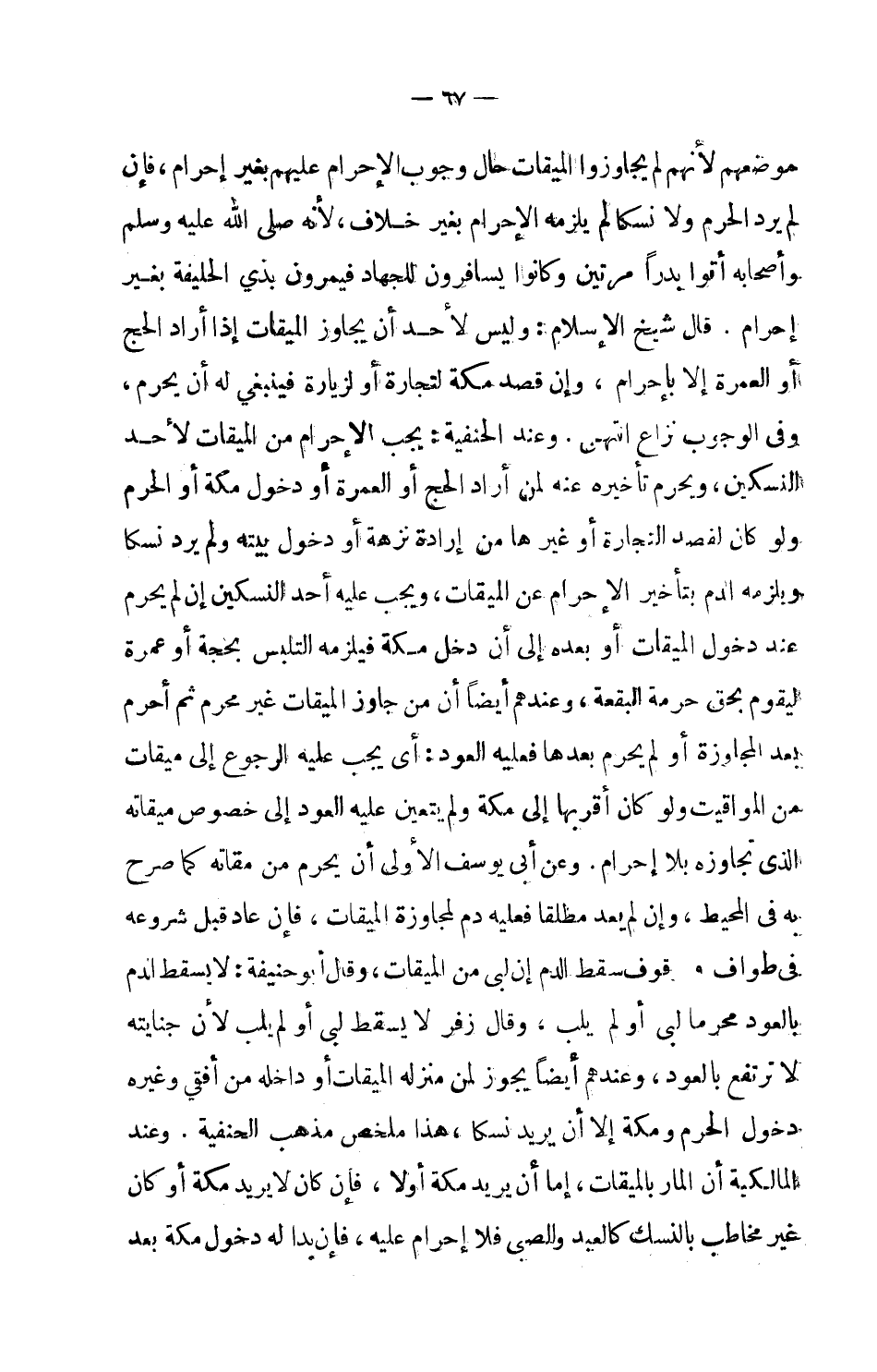 موضعهم، لأنهم لم يجاوزوا الميقات حال وجوب الإحرام عليهم بغير إحرام، فإن لم يرد الحرم ولا نسكا لم يلزمه الإحرام بغير خلاف، لأنه صلى الله عليه وسلم وأصحابه أتوا بدراً مرتين وكانوا يسافرون للجهاد فيمرون بذي الحليفة بغير إحرام. قال شيخ الإسلام: وليس لأحد أن يجاوز الميقات إذا أراد الحج أو العمرة إلا بإحرام، وإن قصد مكة لتجارة أو لزيارة فينبغي له أن يحرم، وفي الوجوب نزاع انتهى. وعند الحنفية: يجب الإحرام من الميقات لأحد النسكين، ويحرم تأخيره عنه لمن أراد الحج أو العمرة أو دخول مكة أو الحرم ولو كان لقصد التجارة أو غيرها من إرادة نزهة أو دخول بيته ولم يرد نسكا، ويلزمه الدم بتأخير الإحرام عن الميقات ويجب عليه أحد النسكين إن لم يحرم عند دخول الميقات أو بعده إلى أن دخل مكة فيلزمه التلبس بحجة أو عمرة ليقوم بحق حرمة البقعة، وعندهم أيضا أن من جاوز الميقات غير محرم ثم أحرم بعد المجاوزة أو لم يحرم بعدها فعليه العود: أي يجب عليه الرجوع إلى ميقات من المواقيت، ولو كان أقربها إلى مكة ولم يتعين عليه العود إلى خصوص ميقاته الذي تجاوزه بلا إحرام. وعن أبي يوسف الأولى أن يحرم من ميقاته كما صرح به في المحيط، وإن لم يعد مطلقا فعليه دم لمجاوزة الميقات.