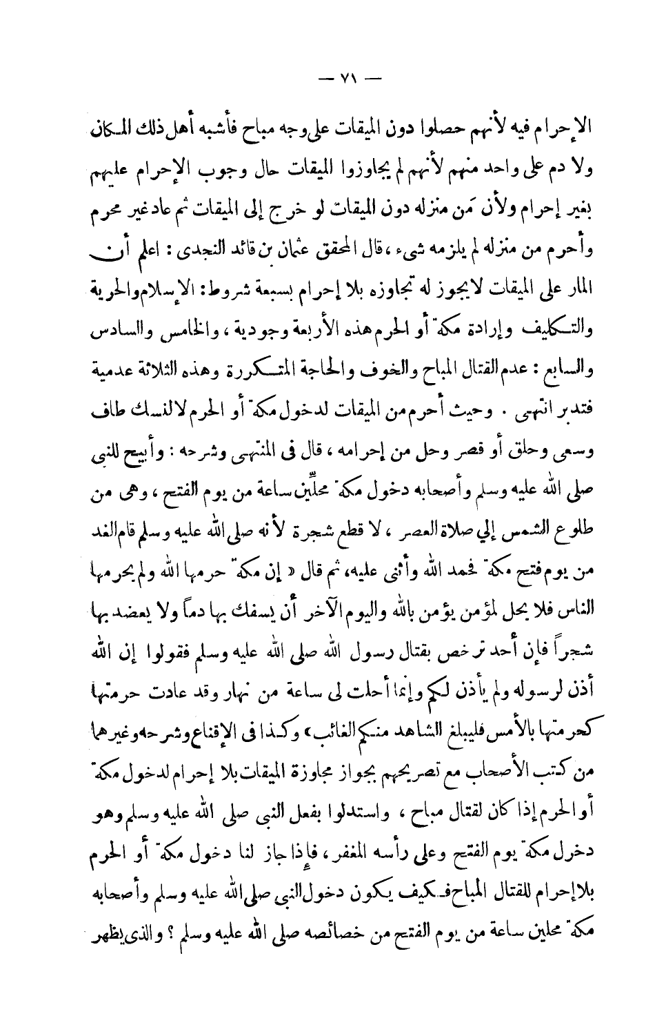 وحيث أحرم من الميقات لدخول مكة أو الحرم لا لنسك طاف وسعى وحلق أو قصر وحل من إحرامه، قال في المنتهى وشرحه: وأبيح للنبي صلى الله عليه وسلم وأصحابه دخول مكة محلِّين ساعة من يوم الفتح، وهي من طلوع الشمس إلى صلاة العصر، لا قطع شجر لأنه صلى الله عليه وسلم قام الغد من يوم فتح مكة فحمد لله وأثنى عليه، ثم قال: (إن مكة حرمها الله ولم يحرمها الناس فلا يحل لمؤمن يؤمن بالله واليوم الآخر أن يسفك بها دماً ولا يعضد بها شجراً، فإن أحد ترخص بقتال رسول الله صلى الله عليه وسلم فقولوا إن الله أذن لرسوله ولم يأذن لكم، وإنما أحلت لي ساعة من نهار وقد عادت حرمتها كحرمتها بالأمس فليبلغ الشاهد منكم الغائب) وكذا في الإقناع وشرحه وغيرهما من كتب الأصحاب مع تصريحهم بجواز مجاوزة الميقات بلا إحرام لدخول مكة أو الحرم إذا كان لقتال مباح، واستدلوا بفعل النبي صلى الله عليه وسلم وهو دخول مكة يوم الفتح وعلى رأسه المغفر، فإذا جاز لنا دخول مكة أو الحرم بلا إحرام للقتال المباح فكيف يكون دخول النبي صلى الله عليه وسلم وأصحابه مكة محلين ساعة من يوم الفتح من خصائصه صلى الله عليه وسلم؟ والذي يظهر