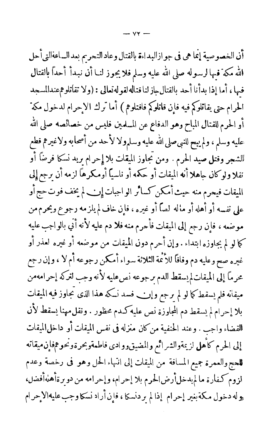 أن الخصوصية إنما هي في جواز البداءة بالقتال وعاد التحريم بعد الساعة التي أحل الله مكة فيها لرسوله صلى الله عليه وسلم فلا يجوز لنا أن نبدأ أحداً بالقتال فيها، أما إذا بدأنا أحد بالقتال جاز لنا قتاله لقوله تعالى: (ولا تقتلوهم عند المسجد الحرام حتى يقاتلوكم فيه فإن قاتلوكم فاقتلوهم) أما ترك الإحرام لدخول مكة أو الحرم للقتال المباح وهو الدفاع عن المسلمين فليس من خصائصه صلى الله عليه وسلم، ولم يبح للنبي صلى الله عليه وسلم ولا لأحد من أصحابه ولا غيرهم قطع الشجر وقتل صيد الحرم.