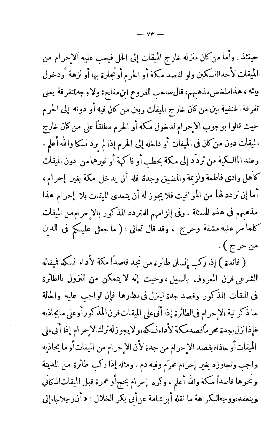 (فائدة) : إذا ركب إنسان طائرة من نجد قاصداً مكة لأداء نسكه فميقاته الشرعي قرن المعروف بالسيل، وحيث إنه لا يتمكن من النزول بالطائرة في الميقات المذكور وقصد جدة لينزل في مطارها فإن الواجب عليه والحالة ما ذكر نية الإحرام في الطائرة إذا أتى على الميقات قرن المذكور أو على ما يحاذيه فإذا نزل بجدة محرماً قصد مكة لأداء نسكه، ولا يجوز له ترك الإحرام إذا أتى على الميقات أو حاذاه بقصد الإحرام من جدة، لأن الإحرام من الميقات أو ما يحاذيه واجب وتجاوزه بغير إحرام محرم وفيه دم. ومثله إذا ركب طائرة من المدينة ونحوها قاصداً مكة والله أعلم. وكره إحرام بحجة أو عمرة قبل الميقات المكاني وينعقد، ووجه الكراهة ما نقله أبو شامة عن أبي بكر الخلال: (أن رجلاً جاء إلى