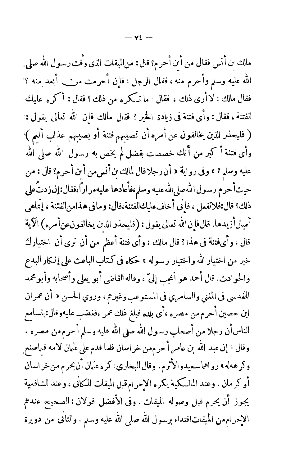 مالك بن أنس فقال من أين أحرم؟ قال: من الميقات الذي وقت رسول الله صلى الله عليه وسلم وأحرم منه، فقال الرجل: فإن أحرمت من أبعد منه؟ فقال مالك: لا أرى ذلك، فقال: ما تكره من ذلك؟ فقال: أكره عليك الفتنة، فقال: وأي فتنة في زيادة الخير؟ فقال مالك فإن الله تعالى يقول: (فليحذر الذين يخالفون عن أمره أن تصيبهم فتنة أو يصيبهم عذاب أليم) وأي فتنة أكبر من أنك خصصت بفضل لم يخص به رسول الله صلى الله عليه وسلم؟ وفي رواية أن رجلاً قال لمالك بن أنس من أين أحرم؟ قال: من حيث أحرم رسول الله صلى الله عليه وسلم، فأعادها عليه مراراً، فقال: إن زدت على ذلك؟ قال: فلا تفعل، فإني أخاف عليك الفتنة، قال: وما في هذا من الفتنة، إنما هي أميال أزيدها. قال فإن الله تعالى يقول: (فليحذر الذين يخالفون عن أمره) الآية. قال: وأي فتنة في هذا؟ قال مالك: وأي فتنة أعظم من أن ترى أن اختيارك خير من اختيار الله واختيار رسوله. حكاه في كتاب الباعث على إنكار البدع والحوادث.
