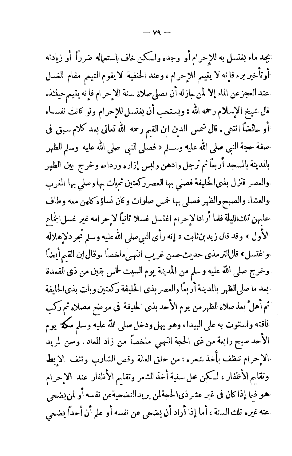 قال شمس الدين ابن القيم رحمه الله تعالى بعد كلام سبق في صفة حجة النبي صلى الله عليه وسلم (فصلى النبي صلى الله عليه وسلم الظهر بالمدين بالمسجد أربعاً ثم ترجل وادهن وليس إزاره ورداءه وخرج بين الظهر والعصر فنزل بذي الحليفة فصلي بها العصر ركعتين ثم بات بها وصلى بها المغرب والعشاء والصبح والظهر فصلى بها خمس صلوات وكان نساؤه كلهن معه وطاف عليهن تلك الليلة فلما أراد الإحرام اغتسل غسلاً ثانياً لإحرامه غير غسل الجماع الأول) وقد قال زيد بن ثابت (إنه رأى النبي صلى الله عليه وسلم تجرد لإهلاله واغتسل) قال الترمذي حديث حسن غريب انتهى ملخصا. وقال ابن القيم أيضا وخرج صلى الله عليه وسلم من المدينة يوم السبت لخمس بقين من ذي القعدة بعد ما صلى الظهر بالمدينة أربعاً والعصر بذي الحليفة ركعتين وبات بذي الحليفة ثم أهلِّ بعد صلاة الظهر من يقوم الأحد بذي الحليفة في موضع مصلاه ثم ركب ناقته واستوت به على البيداء وهو يهل ودخل صلى الله عليه وسلم مكة يوم الأحد صبح رابعة من ذي الحجة انتهى ملخصاً من زاد المعاد. وسن لمريد الإحرام تنظف بأخذ شعره: من حلق العانة وقص الشارب ونتف الإبط وتقليم الأظفار، لكن محل سنية أخذ الشعر وتقليم الأظفار عند الإحرام هو فيما إذا كان في غير عشر ذي الحجة لمن يريد التضحية عن نفسه أو لمن يضحي عنه غيره تلك السنة، أما إذا أراد أن يضحي عن نفسه أو علم أن أحداً يضحي