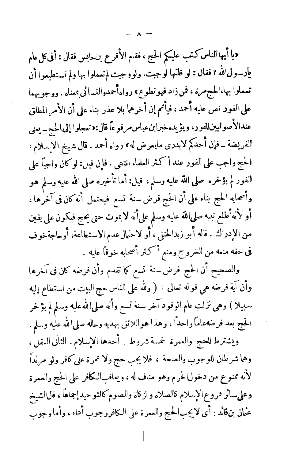 (يا أيها الناس كتب عليكم الحج، فقال الأقرع بن حابس فقال: أفي كل عام يا رسول الله؟ فقال: لو قلتها لوجبت. ولو وجبت لم تعملوا بها ولم تستطيعوا أن تعملوا بها، الحج مرة، فمن زاد فهو تطوع. رواه أحمد والنسائي بمعناه. ووجوبهما على الفور نص عليه أحمد، فيأثم إن أخرهما بلا عذر بناء على أن الأمر المطلق عند الأصوليين للفور، ويؤيد خبر ابن عباس مرفوعاً قال: (تعجلوا إلى الحج - يعني الفريضة - فإن أحدكم لا دري ما يعرض له) . رواه أحمد. قال شيخ الإسلام: الحج واجب على الفور عند أكثر العلماء انتهى.