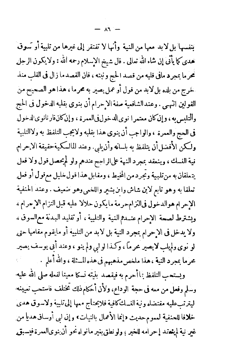 قال شيخ الإسلام رحمه الله: ولا يكون الرجل محرماً بمجرد ما في قلبه من قص الحج ونيته، فإن القصد ما زال في القلب منذ خرج من بلده بل لا بد من قول أو عمل يصير به محرماً، هذا هو الصحيح من القولين انتهى.