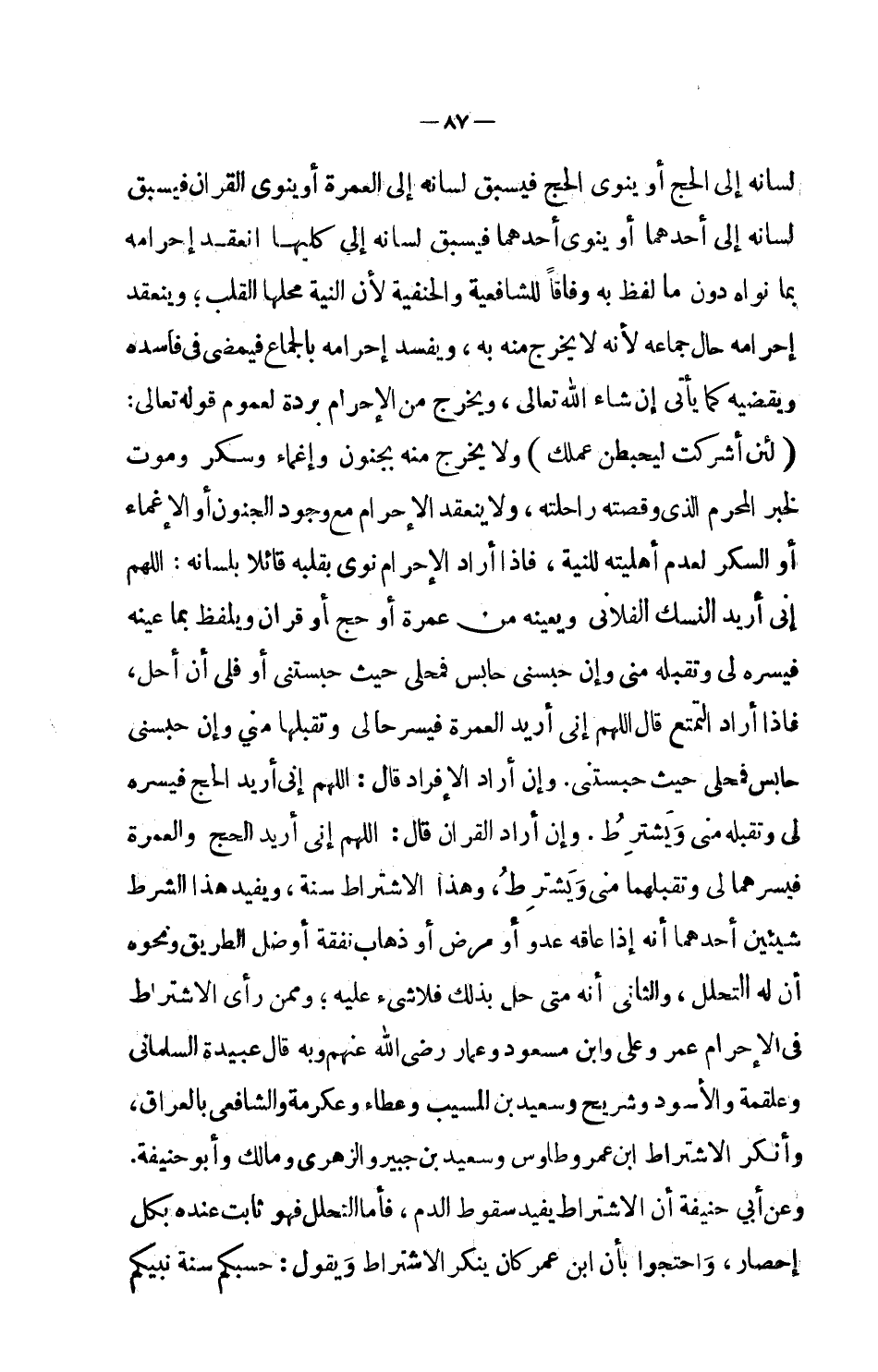 وإن أراد القران قال: اللهم إني أريد الحج والعمرة فيسرهما لي وتقبلهما مني ويشترط، وهذا الاشتراط سنة، ويفيد هذا الشرط شيئين أحدهما أنه إذا عاقه عدو أو مرض أو ذهاب نفقة أو ضل الطريق ونحوه أن له التحلل، والثاني أنه متى حل بذلك فلا شيء عليه، وممن رأى الاشتراط في الإحرام عمر وعلي وابن مسعود وعمار رضي الله عنهم، به قال عبيدة السلماني وعلقمة والأسود وشريح وسعيد بن المسيب وعطاء وعكرمة والشافعي بالعراق، وأنكر الاشتراط ابن عمر وطاوس وسعيد بن جبير والزهري ومالك وأبو حنيفة. وعن أبي حنيفة أن الاشتراط يفيد سقوط الدم، فأما التحلل فهو ثابت عنده بكل إحصار واحتجوا بأن ابن عمر كان ينكر الاشتراط ويقول: حسبكم سنة نبيكم