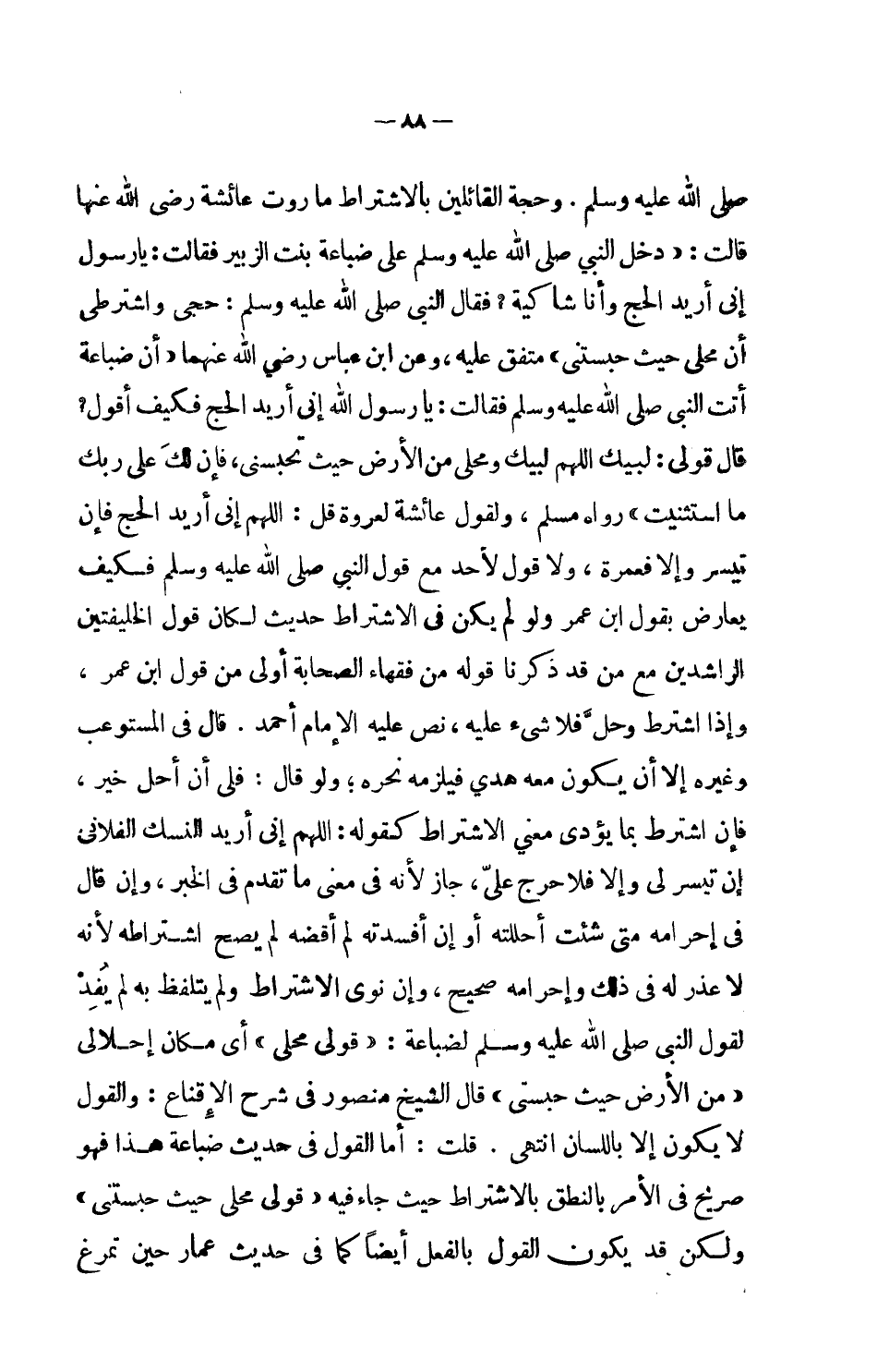 صلى الله عليه وسلم، وحجة القائلين بالاشتراط ما روت عائشة رضي الله عنها قالت: (دخل الني صلى الله عليه وسلم على ضباعة بنت الزبير فقالت: يا رسول الله إني أريد الحج وأنا شاكية؟ فقال النبي صلى الله عليه وسلم: (حجي واشترطي أن محلي حيث حبستني) متفق عليه، وعن ابن عباس رضي الله عنهما (أن ضباعة أتت النبي صلى الله عليه وسلم فقالت: يا رسول الله إني أريد الحج فكيف أقول؟ قال قولي: لبيك اللهم لبيك ومحلي من الأرض حيث تحبسني، فإن لك على ربك ما استثنيت) رواه مسلم، ولقول عائشة لعروة قل: اللهم إني أريد الحج فإن تيسر وإلا فعمرة، ولا قول لأحد مع قول النبي صلى الله عليه وسلم فكيف يعارض بقول ابن عمر، ولو لم يكن في الاشتراط حديث لكان قول الخليفتين الراشدين مع من قد ذكرنا قوله من فقهاء الصحابة أولى من قول ابن عمر، وإذا اشترط وحل فلا شيء عليه، نص عليه الإمام أحمد.