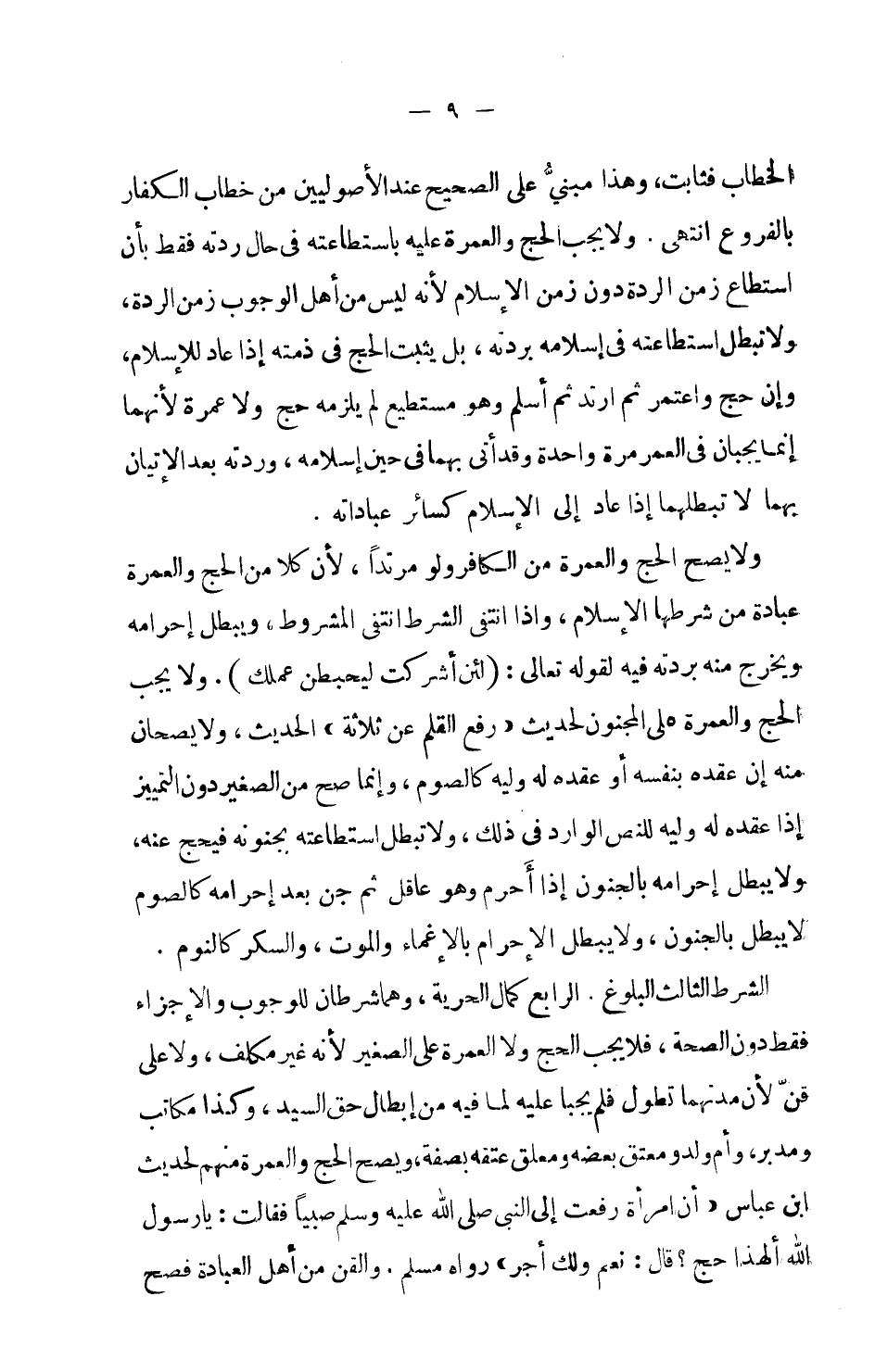 الشرط الثالث البلوغ. الرابع كمال الحرية، وهما شرطان للوجوب والإجزاء فقط دون الصحة، فلا يجب الحج ولا العمرة على الصغير لأنه غير مكلف، ولا على قن لأن مدتهما تطول فلم يجبا عليه؛ لما فيه من إبطال حق السيد، وكذا مكاتب ومدبر، وأم ولد ومعتق بعضه ومعلق عتقه بصفة، ويصح الحج والعمرة منهم لحديث ابن عباس (أن امرأة رفعت إلى النبي صلى الله عليه وسلم صبياً فقالت: يا رسول الله ألهذا حج؟ قال: نعم ولك أجر) . رواه مسلم.