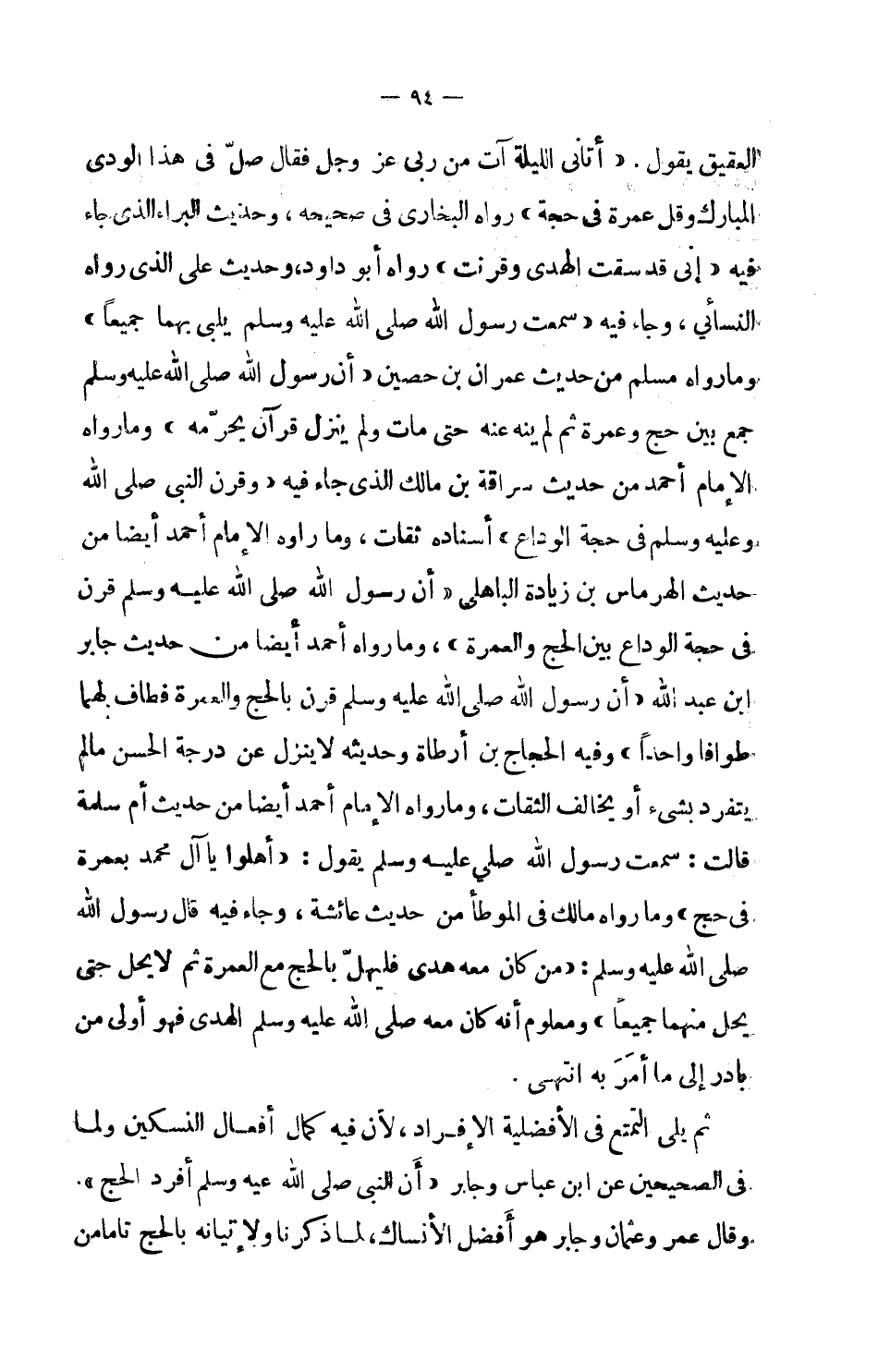 رواه أبو داود، وحديث علي الذي رواه النسائي، وجاء فيه (سمعت رسول الله صلى الله عليه وسلم يلبي بهما جميعاً) وما رواه مسلم من حديث عمران بن حصين (أن رسول الله صلى الله عليه وسلم جمع بين حج وعمرة ثم لم ينه عنه حتى مات ولم ينزل قرآن يحرّمه) وما رواه الإمام أحمد من حديث سراقة بن مالك الذي جاء فيه (وقرن النبي صلى الله عليه وسلم في حجة الوداع) إسناده ثقات، وما رواه الإمام أحمد أيضاً من حديث الهرماس بن زياد الباهلي (أن رسول الله صلى الله عليه وسلم قرن في حجة الوداع بين الحج والعمرة) ، وما رواه أحمد أيضاً من حديث جابر بن عبد الله (أن رسول الله صلى الله عليه وسلم قرن بالحج والعمرة فطاف لهما طوافاً واحداً) وفيه الحجاج بن أرطأة وحديثه لا ينزل عن درجة الحسن ما لم يتفرد بشيء أو يخالف الثقات، وما رواه الإمام أحمد أيضا من حديث أم سلمة قالت: سمعت رسول الله صلى الله عليه وسلم يقول: (أهلوا يا آل محمد بعمرة في حج) وما رواه مالك في الموطأ من حديث عائشة، وجاء فيه قال رسول الله صلى الله عليه وسلم: (من كان معه هدي فليهلّ بالحج مع العمرة ثم لا يحل حتى يحل منهما جميعاً ومعلوم أنه كان معه صلى الله عليه وسلم الهدي فهو أولى من بادر إلى ما أمر به. انتهى.