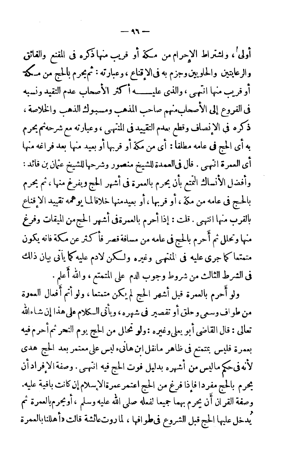 أولى، واشتراط الإحرام من مكة أو قريب منها ذكره في المقنع والفائق والرعايتين والحاويين وجزم به في الإقناع، وعبارته: ثم يحرم بالحج من مكة أو قريب منها انتهى. والذي عليه أكثر الأصحاب عدم التقييد ونسبه في الفروع إلى الأصحاب منهم صاحب المذهب ومسبوك الذهب والخلاصة، ذكره في الإنصاف وقطع بعدم التقييد في المنتهى، وعبارته مع شرحه ثم يحرم به أي الحج في عامه مطلقاً: أي من مكة أو قربها أو بعيد منها بعد فراغه منها أي العمرة انتهى.