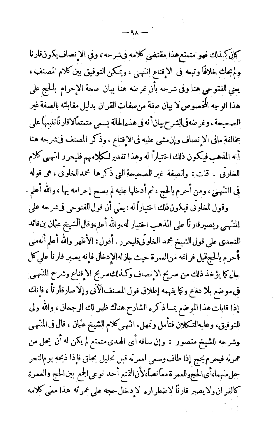 وقول الخلوتي فيكون ذلك اختياراً له: يعني أن قول الفتوحي في شرحه على المنتهى ويصير قارناً على المذهب اختيار له، والله أعلم، وقال الشيخ عثمان بن قائد النجدي على قول الشيخ محمد الخلوتي فليحرر. أقول: الأظهر والله أعلم أنه متى أحرم بالحج قبل فراغه من العمرة حيث جاز له الإدخال فإنه يصير قارناً على كل حال كما يؤخذ ذلك من صريح الإنصاف وكذلك صريح الإقناع وشرح المنتهى في موضع بلا دفاع وكما يفهمه إطلاق قول المصنف الآتي وإلا صار قارناً، فإنك إذا قابلت هذا الموضع بما ذكره الشارح هناك ظهر لك الرجحان، والله ولي التوفيق.