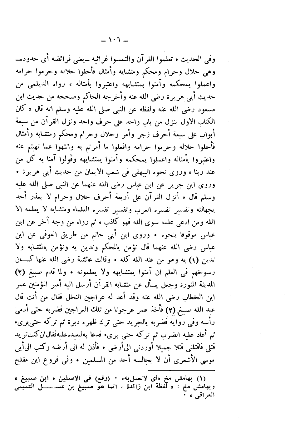 وَفِي الْحَدِيثِ " «تَعَلَّمُوا الْقُرْآنَ وَالْتَمِسُوا غَرَائِبَهُ - يَعْنِي فَرَائِضَهُ أَيْ حُدُودَهُ - وَهِيَ حَلَالٌ وَحَرَامٌ، وَمُحْكَمٌ وَمُتَشَابِهٌ وَأَمْثَالٌ، فَأَحِلُّوا حَلَالَهُ، وَحَرِّمُوا حَرَامَهُ، وَاعْمَلُوا بِمُحْكَمِهِ، وَآمِنُوا بِمُتَشَابِهِهِ، وَاعْتَبِرُوا بِأَمْثَالِهِ» ". رَوَاهُ الدَّيْلَمِيُّ مِنْ حَدِيثِ أَبِي هُرَيْرَةَ - رَضِيَ اللَّهُ عَنْهُ، وَأَخْرَجَهُ الْحَاكِمُ وَصَحَّحَهُ مِنْ حَدِيثِ ابْنِ مَسْعُودٍ - رَضِيَ اللَّهُ عَنْهُ - وَلَفْظُهُ عَنِ النَّبِيِّ - صَلَّى اللَّهُ عَلَيْهِ وَسَلَّمَ - أَنَّهُ قَالَ: " «كَانَ الْكِتَابُ الْأَوَّلُ يَنْزِلُ مِنْ بَابٍ وَاحِدٍ عَلَى حَرْفٍ وَاحِدٍ، وَنَزَلَ الْقُرْآنُ مِنْ سَبْعَةِ أَبْوَابٍ عَلَى سَبْعَةِ أَحْرُفٍ: زَجْرٍ وَأَمْرٍ وَحَلَالٍ وَحَرَامٍ وَمُحْكَمٍ وَمُتَشَابِهٍ وَأَمْثَالٍ، فَأَحِلُّوا حَلَالَهُ، وَحَرِّمُوا حَرَامَهُ، وَافْعَلُوا مَا أُمِرْتُمْ بِهِ، وَانْتَهُوا عَمَّا نُهِيتُمْ عَنْهُ، وَاعْتَبِرُوا بِأَمْثَالِهِ، وَاعْمَلُوا بِمُحْكَمِهِ، وَآمِنُوا بِمُتَشَابِهِهِ، وَقُولُوا آمَنَّا بِهِ كُلٌّ مِنْ عِنْدِ رَبِّنَا» ". وَرَوَى نَحْوَهُ الْبَيْهَقِيُّ فِي شُعَبِ الْإِيمَانِ مِنْ حَدِيثِ أَبِي هُرَيْرَةَ. وَرَوَى ابْنُ جَرِيرٍ، عَنِ ابْنِ عَبَّاسٍ - رَضِيَ اللَّهُ عَنْهُمَا، عَنِ النَّبِيِّ - صَلَّى اللَّهُ عَلَيْهِ وَسَلَّمَ - قَالَ: " «أُنْزِلَ الْقُرْآنُ عَلَى أَرْبَعَةِ أَحْرُفٍ: حَلَالٍ وَحَرَامٍ لَا يُعْذَرُ أَحَدٌ بِجَهَالَتِهِ، وَتَفْسِيرٍ تُفَسِّرُهُ الْعَرَبُ، وَتَفْسِيرٍ تُفَسِّرُهُ الْعُلَمَاءُ، وَمُتَشَابِهٍ لَا يَعْلَمُهُ إِلَّا اللَّهُ، وَمَنِ ادَّعَى عِلْمَهُ سِوَى اللَّهِ فَهُوَ كَاذِبٌ» ". ثُمَّ رَوَاهُ مِنْ وَجْهٍ آخَرَ، عَنِ ابْنِ عَبَّاسٍ مَوْقُوفًا بِنَحْوِهِ. وَرَوَى ابْنُ أَبِي حَاتِمٍ مِنْ طَرِيقِ الْعَوْفِيِّ، عَنِ ابْنِ عَبَّاسٍ - رَضِيَ اللَّهُ عَنْهُمَا - قَالَ: نُؤْمِنُ بِالْمُحْكَمِ، وَنَدِينُ بِهِ، وَنُؤْمِنُ بِالْمُتَشَابِهِ، وَلَا نَدِينُ بِهِ، وَهُوَ مِنْ عِنْدِ اللَّهِ كُلُّهُ. وَقَالَتْ عَائِشَةُ - رَضِيَ اللَّهُ عَنْهَا: كَانَ رُسُوخُهُمْ فِي الْعِلْمِ أَنْ آمَنُوا بِمُتَشَابِهِهٍ وَلَا يَعْلَمُونَهُ. وَلَمَّا قَدِمَ صَبِيغٌ الْمَدِينَةَ الْمُنَوَّرَةَ وَجَعَلَ يَسْأَلُ عَنْ مُتَشَابِهِ الْقُرْآنِ، أَرْسَلَ إِلَيْهِ أَمِيرُ الْمُؤْمِنِينَ عُمَرُ بْنُ الْخَطَّابِ - رَضِيَ اللَّهُ عَنْهُ - وَقَدْ أَعَدَّ لَهُ عَرَاجِينَ النَّخْلِ، فَقَالَ: مَنْ أَنْتَ؟ قَالَ: عَبْدُ اللَّهِ صَبِيغٌ. فَأَخَذَ عُمَرُ عُرْجُونًا مِنْ تِلْكَ الْعَرَاجِينِ، فَضَرَبَهُ حَتَّى أَدْمَى رَأْسَهُ، وَفِي رِوَايَةٍ: فَضَرَبَهُ بِالْجَرِيدِ حَتَّى تَرَكَ ظَهْرَهُ دَبَرَةً، ثُمَّ تَرَكَهُ حَتَّى بَرِئَ، ثُمَّ أَعَادَ عَلَيْهِ الضَّرْبَ، ثُمَّ تَرَكَهُ حَتَّى بَرِئَ، فَدَعَا بِهِ لِيُعِيدَهُ عَلَيْهِ، فَقَالَ: إِنْ كُنْتَ تُرِيدُ قَتْلِي، فَاقْتُلْنِي قَتْلًا جَمِيلًا، أَوْ رُدَّنِي إِلَى أَرْضِي. فَأَذِنَ لَهُ إِلَى أَرْضِهِ، وَكَتَبَ إِلَى أَبِي مُوسَى الْأَشْعَرِيِّ أَنْ لَا يُجَالِسَهُ أَحَدٌ مِنَ الْمُسْلِمِينَ.