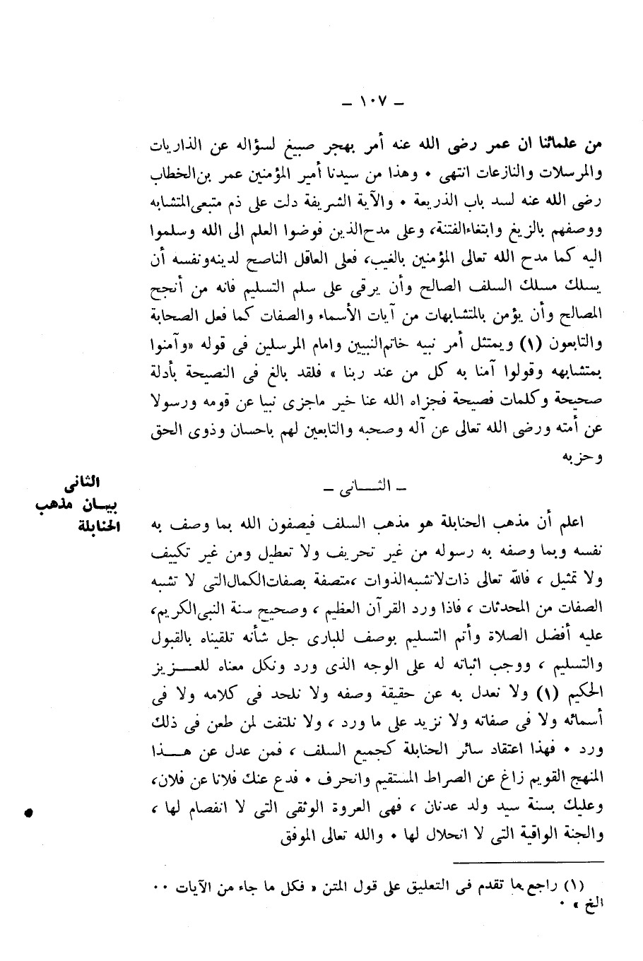 اعْلَمْ أَنَّ مَذْهَبَ الْحَنَابِلَةِ هُوَ مَذْهَبُ السَّلَفِ، فَيَصِفُونَ اللَّهَ بِمَا وَصَفَ بِهِ نَفْسَهُ، وَبِمَا وَصَفَهُ بِهِ رَسُولُهُ مِنْ غَيْرِ تَحْرِيفٍ وَلَا تَعْطِيلٍ، وَمِنْ غَيْرِ تَكْيِيفٍ وَلَا تَمْثِيلٍ، فَاللَّهُ - تَعَالَى - ذَاتٌ لَا تُشْبِهُ الذَّوَاتِ، مُتَّصِفَةٌ بِصِفَاتِ الْكَمَالِ الَّتِي لَا تُشْبِهُ الصِّفَاتِ مِنَ الْمُحْدَثَاتِ، فَإِذَا وَرَدَ الْقُرْآنُ الْعَظِيمُ، وَصَحِيحُ سُنَّةِ النَّبِيِّ الْكَرِيمِ - عَلَيْهِ أَفْضَلُ الصَّلَاةِ وَأَتَمُّ التَّسْلِيمِ - بِوَصْفٍ لِلْبَارِي - جَلَّ شَأْنُهُ، تَلَقَّيْنَاهُ بِالْقَبُولِ وَالتَّسْلِيمِ، وَوَجَبَ إِثْبَاتُهُ لَهُ عَلَى الْوَجْهِ الَّذِي وَرَدَ، وَنَكِلُ مَعْنَاهُ لِلْعَزِيزِ الْحَكِيمِ، وَلَا نَعْدِلُ بِهِ عَنْ حَقِيقَةِ وَصْفِهِ، وَلَا نُلْحِدُ فِي كَلَامِهِ، وَلَا فِي أَسْمَائِهِ، وَلَا فِي صِفَاتِهِ، وَلَا نَزِيدُ عَلَى مَا وَرَدَ، وَلَا نَلْتَفِتُ لِمَنْ طَعَنَ فِي ذَلِكَ وَرَدَّ. فَهَذَا اعْتِقَادُ سَائِرِ الْحَنَابِلَةِ كَجَمِيعِ السَّلَفِ، فَمَنْ عَدَلَ عَنْ هَذَا الْمَنْهَجِ الْقَوِيِّ، زَاغَ عَنِ الصِّرَاطِ الْمُسْتَقِيمِ وَانْحَرَفَ. فَدَعْ عَنْكَ فُلَانًا عَنْ فُلَانٍ، وَعَلَيْكَ بِسُنَّةِ سَيِّدِ وَلَدِ عَدْنَانَ، فَهِيَ الْعُرْوَةُ الْوُثْقَى الَّتِي لَا انْفِصَامَ لَهَا، وَالْجُنَّةُ الْوَاقِيَةُ الَّتِي لَا انْحِلَالَ لَهَا. وَاللَّهُ - تَعَالَى - الْمُوَفِّقُ.