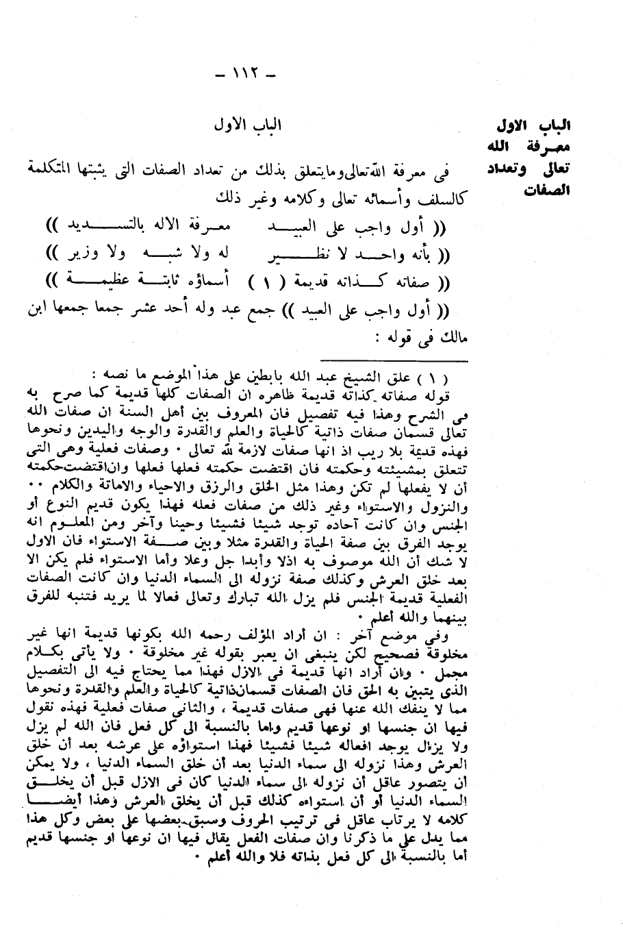 الْبَابُ الْأَوَّلُ فِي مَعْرِفَةِ اللَّهِ - تَعَالَى - وَمَا يَتَعَلَّقُ بِذَلِكَ مِنْ تَعْدَادِ الصِّفَاتِ الَّتِي يُثْبِتُهَا الْمُتَكَلِّمَةُ كَالسَّلَفِ وَأَسْمَائِهِ - تَعَالَى - وَكَلَامِهِ وَغَيْرِ ذَلِكَ