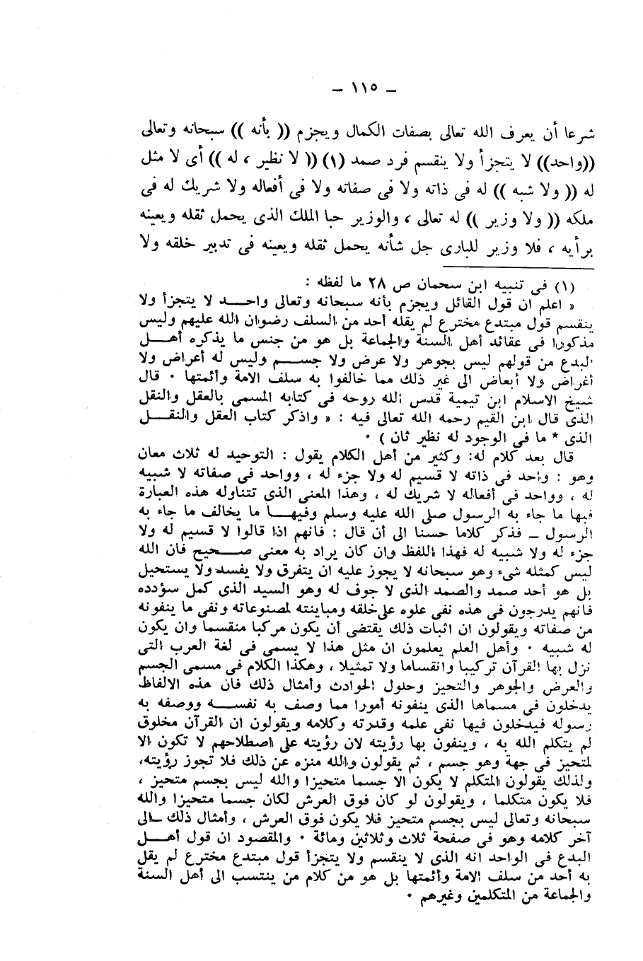 شَرْعًا أَنْ يَعْرِفَ اللَّهَ - تَعَالَى - بِصِفَاتِ الْكَمَالِ، وَيَجْزِمَ (بِأَنَّهُ) - سُبْحَانَهُ وَتَعَالَى - (وَاحِدٌ) لَا يَتَجَزَّأُ وَلَا يَنْقَسِمُ، فَرْدٌ صَمَدٌ، (لَا نَظِيرَ لَهُ) ، أَيْ لَا مِثْلَ لَهُ، (وَلَا شِبْهَ) لَهُ فِي ذَاتِهِ، وَلَا فِي صِفَاتِهِ، وَلَا فِي أَفْعَالِهِ، وَلَا شَرِيكَ لَهُ فِي مُلْكِهِ، (وَلَا وَزِيرَ) لَهُ - تَعَالَى، وَالْوَزِيرُ حَبَا الْمَلِكِ الَّذِي يَحْمِلُ ثِقَلَهُ وَيُعِينُهُ بِرَأْيِهِ، فَلَا وَزِيرَ لِلْبَارِي - جَلَّ شَأْنُهُ - يَحْمِلُ ثِقَلَهُ، وَيُعِينُهُ فِي تَدْبِيرِ خَلْقِهِ، وَلَا