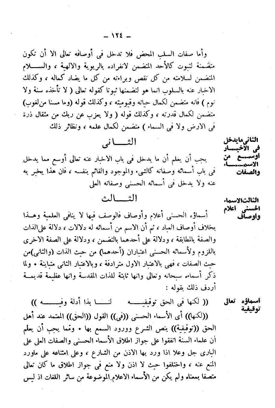 (لَكِنَّهَا) أَيِ الْأَسْمَاءَ الْحُسْنَى (فِي) الْقَوْلِ (الْحَقِّ) الْمُعْتَمَدِ عِنْدَ أَهْلِ الْحَقِّ (تَوْقِيفِيَّةٌ) بِنَصِّ الشَّرْعِ وَوُرُودِ السَّمْعِ بِهَا. وَمِمَّا يَجِبُ أَنْ يُعْلَمَ أَنَّ عُلَمَاءَ السُّنَّةِ اتَّفَقُوا عَلَى جَوَازِ إِطْلَاقِ الْأَسْمَاءِ الْحُسْنَى وَالصِّفَاتِ الْعُلَى عَلَى الْبَارِي - جَلَّ وَعَلَا - إِذَا وَرَدَ بِهَا الْإِذْنُ مِنَ الشَّارِعِ، وَعَلَى امْتِنَاعِهِ عَلَى مَا وَرَدَ الْمَنْعُ عَنْهُ، وَاخْتَلَفُوا حَيْثُ لَا إِذْنَ وَلَا مَنْعَ فِي جَوَازِ إِطْلَاقِ مَا كَانَ - تَعَالَى - مُتَّصِفًا بِمَعْنَاهُ وَلَمْ يَكُنْ مِنَ الْأَسْمَاءِ الْأَعْلَامِ الْمَوْضُوعَةِ مِنْ سَائِرِ اللُّغَاتِ، إِذْ لَيْسَ