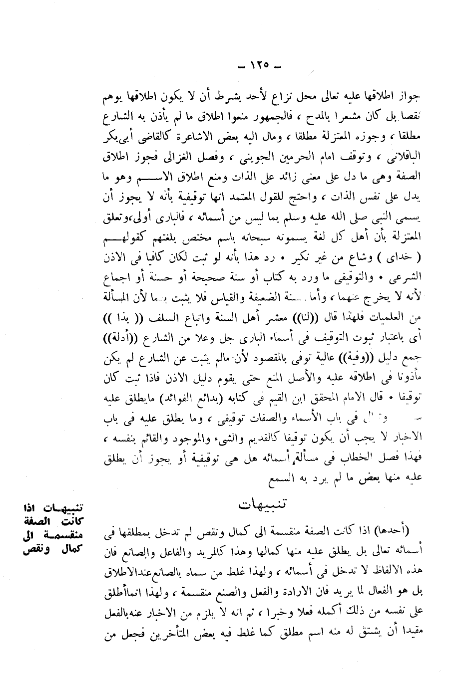 جَوَازُ إِطْلَاقِهَا عَلَيْهِ - تَعَالَى - مَحَلُّ نِزَاعٍ لِأَحَدٍ، بِشَرْطِ أَنْ لَا يَكُونَ إِطْلَاقُهَا يُوهِمُ نَقْصًا، بَلْ كَانَ مُشْعِرًا بِالْمَدْحِ، فَالْجُمْهُورُ مَنَعُوا إِطْلَاقَ مَا لَمْ يَأْذَنْ بِهِ الشَّارِعُ مُطْلَقًا، وَجَوَّزَهُ الْمُعْتَزِلَةُ مُطْلَقًا، وَمَالَ إِلَيْهِ بَعْضُ الْأَشَاعِرَةِ، كَالْقَاضِي أَبِي بَكْرٍ الْبَاقِلَّانِيِّ، وَتَوَقَّفَ إِمَامُ الْحَرَمَيْنِ الْجُوَيْنِيُّ، وَفَصَّلَ الْغَزَّالِيُّ فَجَوَّزَ إِطْلَاقَ الصِّفَةِ، وَهِيَ مَا دَلَّ عَلَى مَعْنًى زَائِدٍ عَلَى الذَّاتِ، وَمَنَعَ إِطْلَاقَ الِاسْمِ، وَهُوَ مَا يَدُلُّ عَلَى نَفْسِ الذَّاتِ، وَاحْتَجَّ لِلْقَوْلِ الْمُعْتَمَدِ أَنَّهَا تَوْقِيفِيَّةٌ بِأَنَّهُ لَا يَجُوزُ أَنْ يُسَمَّى النَّبِيُّ - صَلَّى اللَّهُ عَلَيْهِ وَسَلَّمَ - بِمَا لَيْسَ مِنْ أَسْمَائِهِ، فَالْبَارِي أَوْلَى، وَتَعَلَّقَ الْمُعْتَزِلَةُ بِأَنَّ أَهْلَ كُلِّ لُغَةٍ يُسَمُّونَهُ - سُبْحَانَهُ - بِاسْمٍ مُخْتَصٍّ بِلُغَتِهِمْ، كَقَوْلِهِمْ (خداي) وَشَاعَ مِنْ غَيْرِ نَكِيرٍ. رُدَّ هَذَا بِأَنَّهُ لَوْ ثَبَتَ، لَكَانَ كَافِيًا فِي الْإِذْنِ الشَّرْعِيِّ. وَالتَّوْقِيفِيُّ مَا وَرَدَ بِهِ كِتَابٌ أَوْ سُنَّةٌ صَحِيحَةٌ أَوْ حَسَنَةٌ أَوْ إِجْمَاعٌ ; لِأَنَّهُ لَا يَخْرُجُ عَنْهُمَا، وَأَمَّا السُّنَّةُ الضَّعِيفَةُ وَالْقِيَاسُ، فَلَا يَثْبُتُ بِهِمَا ; لِأَنَّ الْمَسْأَلَةَ مِنَ الْعِلْمِيَّاتِ، فَلِهَذَا قَالَ (لَنَا) مَعْشَرَ أَهْلِ السُّنَّةِ وَأَتْبَاعِ السَّلَفِ، (بِذَا) أَيْ بِاعْتِبَارِ ثُبُوتِ التَّوْقِيفِ فِي أَسْمَاءِ الْبَارِي - جَلَّ وَعَلَا - مِنَ الشَّارِعِ (أَدِلَّةٌ) ، جَمْعُ دَلِيلٍ، (وَفِيَّةٌ) عَالِيَةٌ، تُوفِي بِالْمَقْصُودِ ; لِأَنَّ مَا لَمْ يَثْبُتْ عَنِ الشَّارِعِ، لَمْ يَكُنْ مَأْذُونًا فِي إِطْلَاقِهِ عَلَيْهِ، وَالْأَصْلُ الْمَنْعُ حَتَّى يَقُومَ دَلِيلُ الْإِذْنِ، فَإِذَا ثَبَتَ كَانَ تَوْقِيفًا.