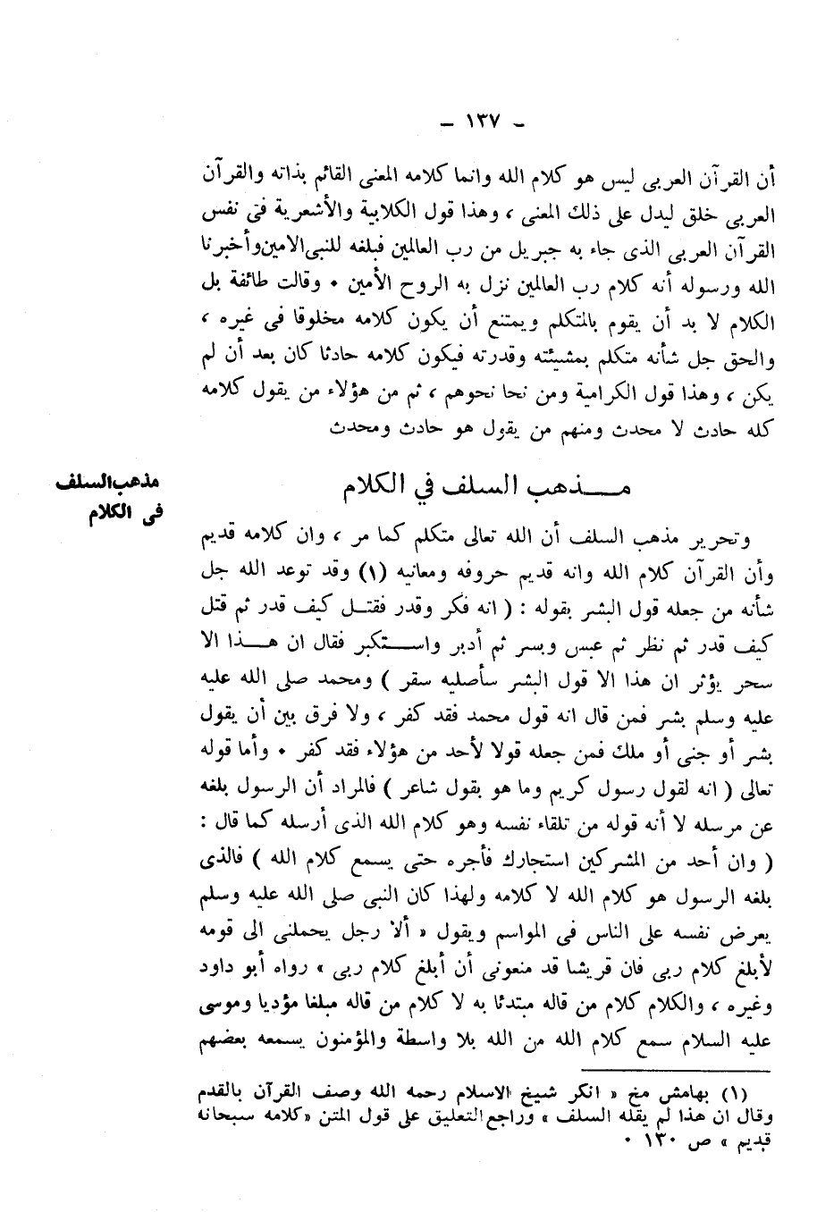 وَتَحْرِيرُ مَذْهَبِ السَّلَفِ أَنَّ اللَّهَ - تَعَالَى - مُتَكَلِّمٌ كَمَا مَرَّ، وَأَنَّ كَلَامَهُ قَدِيمٌ، وَأَنَّ الْقُرْآنَ كَلَامُ اللَّهِ، وَأَنَّهُ قَدِيمٌ حُرُوفُهُ وَمَعَانِيهُ، وَقَدْ تَوَعَّدَ اللَّهُ - جَلَّ شَأْنُهُ - مَنْ جَعَلَهُ قَوْلَ الْبَشَرِ بِقَوْلِهِ: {إِنَّهُ فَكَّرَ وَقَدَّرَ - فَقُتِلَ كَيْفَ قَدَّرَ - ثُمَّ قُتِلَ كَيْفَ قَدَّرَ - ثُمَّ نَظَرَ ثُمَّ عَبَسَ وَبَسَرَ - ثُمَّ أَدْبَرَ وَاسْتَكْبَرَ - فَقَالَ إِنْ هَذَا إِلَّا سِحْرٌ يُؤْثَرُ - إِنْ هَذَا إِلَّا قَوْلُ الْبَشَرِ - سَأُصْلِيهِ سَقَرَ} [المدثر: 18 - 26] ، وَمُحَمَّدٌ - صَلَّى اللَّهُ عَلَيْهِ وَسَلَّمَ - بَشَرٌ، فَمَنْ قَالَ إِنَّهُ قَوْلُ مُحَمَّدٍ فَقَدْ كَفَرَ، وَلَا فَرْقَ بَيْنَ أَنْ يَقُولَ بَشَرٌ أَوْ جِنِّيٌّ أَوْ مَلَكٌ، فَمَنْ جَعَلَهُ قَوْلًا لِأَحَدٍ مِنْ هَؤُلَاءِ، فَقَدْ كَفَرَ. وَأَمَّا قَوْلُهُ - تَعَالَى: {إِنَّهُ لَقَوْلُ رَسُولٍ كَرِيمٍ - وَمَا هُوَ بِقَوْلِ شَاعِرٍ} [الحاقة: 40 - 41] ، فَالْمُرَادُ أَنَّ الرَّسُولَ بَلَّغَهُ عَنْ مُرْسِلِهِ، لَا أَنَّهُ قَوْلُهُ مِنْ تِلْقَاءِ نَفْسِهِ، وَهُوَ كَلَامُ اللَّهِ الَّذِي أَرْسَلَهُ، كَمَا قَالَ: {وَإِنْ أَحَدٌ مِنَ الْمُشْرِكِينَ اسْتَجَارَكَ فَأَجِرْهُ حَتَّى يَسْمَعَ كَلَامَ اللَّهِ} [التوبة: 6] ، فَالَّذِي بَلَّغَهُ الرَّسُولُ هُوَ كَلَامُ اللَّهِ لَا كَلَامُهُ، وَلِهَذَا كَانَ النَّبِيُّ - صَلَّى اللَّهُ عَلَيْهِ وَسَلَّمَ - يَعْرِضُ نَفْسَهُ عَلَى النَّاسِ فِي الْمَوَاسِمِ، وَيَقُولُ: " «أَلَا رَجُلٌ يَحْمِلُنِي إِلَى قَوْمِهِ لِأُبَلِّغَ كَلَامَ رَبِّي، فَإِنَّ قُرَيْشًا قَدْ مَنَعُونِي أَنْ أُبَلِّغَ كَلَامَ رَبِّي» ". رَوَاهُ أَبُو دَاوُدَ وَغَيْرُهُ، وَالْكَلَامُ كَلَامُ مَنْ قَالَهُ مُبْتَدِئًا بِهِ، لَا كَلَامُ مَنْ قَالَهُ مُبَلِّغًا مُؤَدِّيًا، وَمُوسَى - عَلَيْهِ السَّلَامُ - سَمِعَ كَلَامَ اللَّهِ مِنَ اللَّهِ بِلَا وَاسِطَةٍ، وَالْمُؤْمِنُونَ يَسْمَعُهُ بَعْضُهُمْ