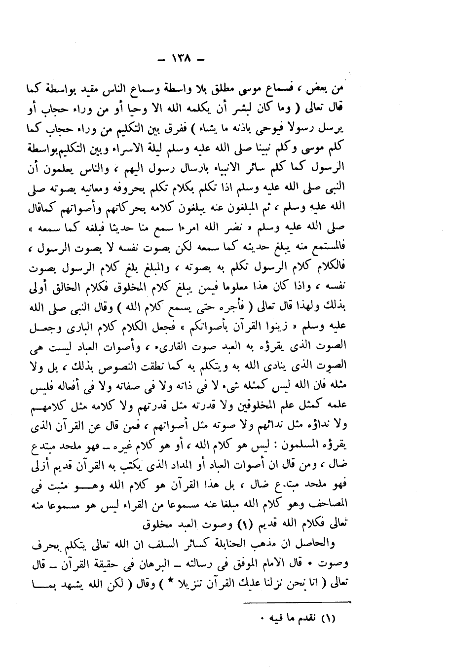 مِنْ بَعْضٍ، فَسَمَاعُ مُوسَى مُطْلَقٌ بِلَا وَاسِطَةٍ، وَسَمَاعُ النَّاسِ مُقَيَّدٌ بِوَاسِطَةٍ، كَمَا قَالَ - تَعَالَى: {وَمَا كَانَ لِبَشَرٍ أَنْ يُكَلِّمَهُ اللَّهُ إِلَّا وَحْيًا أَوْ مِنْ وَرَاءِ حِجَابٍ أَوْ يُرْسِلَ رَسُولًا فَيُوحِيَ بِإِذْنِهِ مَا يَشَاءُ} [الشورى: 51] ، فَفَرَّقَ بَيْنَ التَّكْلِيمِ مِنْ وَرَاءِ حِجَابٍ كَمَا كَلَّمَ مُوسَى وَكَلَّمَ نَبِيَّنَا - صَلَّى اللَّهُ عَلَيْهِ وَسَلَّمَ - لَيْلَةَ الْإِسْرَاءِ، وَبَيْنَ التَّكْلِيمِ بِوَاسِطَةِ الرَّسُولِ كَمَا كَلَّمَ سَائِرَ الْأَنْبِيَاءِ بِإِرْسَالِ رَسُولٍ إِلَيْهِمْ، وَالنَّاسُ يَعْلَمُونَ أَنَّ النَّبِيَّ - صَلَّى اللَّهُ عَلَيْهِ وَسَلَّمَ - إِذَا تَكَلَّمَ بِكَلَامٍ، تَكَلَّمَ بِحُرُوفِهِ وَمَعَانِيهِ بِصَوْتِهِ - صَلَّى اللَّهُ عَلَيْهِ وَسَلَّمَ، ثُمَّ الْمُبَلِّغُونَ عَنْهُ يُبَلِّغُونَ كَلَامَهُ بِحَرَكَاتِهِمْ وَأَصْوَاتِهِمْ، كَمَا قَالَ - صَلَّى اللَّهُ عَلَيْهِ وَسَلَّمَ: " «نَضَّرَ اللَّهُ امْرَأً سَمِعَ مِنَّا حَدِيثًا فَبَلَّغَهُ كَمَا سَمِعَهُ» "، فَالْمُسْتَمِعُ مِنْهُ يُبَلِّغُ حَدِيثَهُ كَمَا سَمِعَهُ لَكِنْ بِصَوْتِ نَفْسِهِ لَا بِصَوْتِ الرَّسُولِ، فَالْكَلَامُ كَلَامُ الرَّسُولِ، تَكَلَّمَ بِهِ بِصَوْتِهِ، وَالْمُبَلِّغُ بَلَّغَ كَلَامَ الرَّسُولِ بِصَوْتِ نَفْسِهِ، وَإِذَا كَانَ هَذَا مَعْلُومًا فِيمَنْ يُبَلِّغُ كَلَامَ الْمَخْلُوقِ، فَكَلَامُ الْخَالِقِ أَوْلَى بِذَلِكَ، وَلِهَذَا قَالَ - تَعَالَى: {فَأَجِرْهُ حَتَّى يَسْمَعَ كَلَامَ اللَّهِ} [التوبة: 6] ، وَقَالَ النَّبِيُّ - صَلَّى اللَّهُ عَلَيْهِ وَسَلَّمَ: " «زَيِّنُوا الْقُرْآنَ بِأَصْوَاتِكُمْ» "، فَجَعَلَ الْكَلَامَ كَلَامَ الْبَارِي، وَجَعَلَ الصَّوْتَ الَّذِي يَقْرَؤُهُ بِهِ الْعَبْدُ صَوْتَ الْقَارِئِ، وَأَصْوَاتُ الْعِبَادِ لَيْسَتْ هِيَ الصَّوْتَ الَّذِي يُنَادِي اللَّهُ بِهِ وَيَتَكَلَّمُ بِهِ كَمَا نَطَقَتِ النُّصُوصُ بِذَلِكَ، بَلْ وَلَا مِثْلَهُ، فَإِنَّ اللَّهَ لَيْسَ كَمِثْلِهِ شَيْءٌ، لَا فِي ذَاتِهِ وَلَا فِي صِفَاتِهِ وَلَا فِي أَفْعَالِهِ، فَلَيْسَ عِلْمُهُ كَمِثْلِ عِلْمِ الْمَخْلُوقِينَ، وَلَا قُدْرَتُهُ مِثْلَ قُدْرَتِهِمْ، وَلَا كَلَامُهُ مِثْلَ كَلَامِهِمْ، وَلَا نِدَاؤُهُ مِثْلَ نِدَائِهِمْ، وَلَا صَوْتُهُ مِثْلَ أَصْوَاتِهِمْ، فَمَنْ قَالَ عَنِ الْقُرْآنِ الَّذِي يَقْرَؤُهُ الْمُسْلِمُونَ: لَيْسَ هُوَ كَلَامَ اللَّهِ، أَوْ هُوَ كَلَامُ غَيْرِهِ، فَهُوَ مُلْحِدٌ مُبْتَدِعٌ ضَالٌّ، وَمَنْ قَالَ: إِنَّ أَصْوَاتَ الْعِبَادِ أَوِ الْمِدَادَ الَّذِي يُكْتَبُ بِهِ الْقُرْآنُ قَدِيمٌ أَزَلِيٌّ، فَهُوَ مُلْحِدٌ مُبْتَدِعٌ ضَالٌّ، بَلْ هَذَا الْقُرْآنُ هُوَ كَلَامُ اللَّهِ، وَهُوَ مُثْبَتٌ فِي الْمَصَاحِفِ، وَهُوَ كَلَامُ اللَّهِ مُبَلَّغًا عَنْهُ مَسْمُوعًا مِنَ الْقُرَّاءِ، لَيْسَ هُوَ مَسْمُوعًا مِنْهُ - تَعَالَى، فَكَلَامُ اللَّهِ قَدِيمٌ، وَصَوْتُ الْعَبْدِ مَخْلُوقٌ.