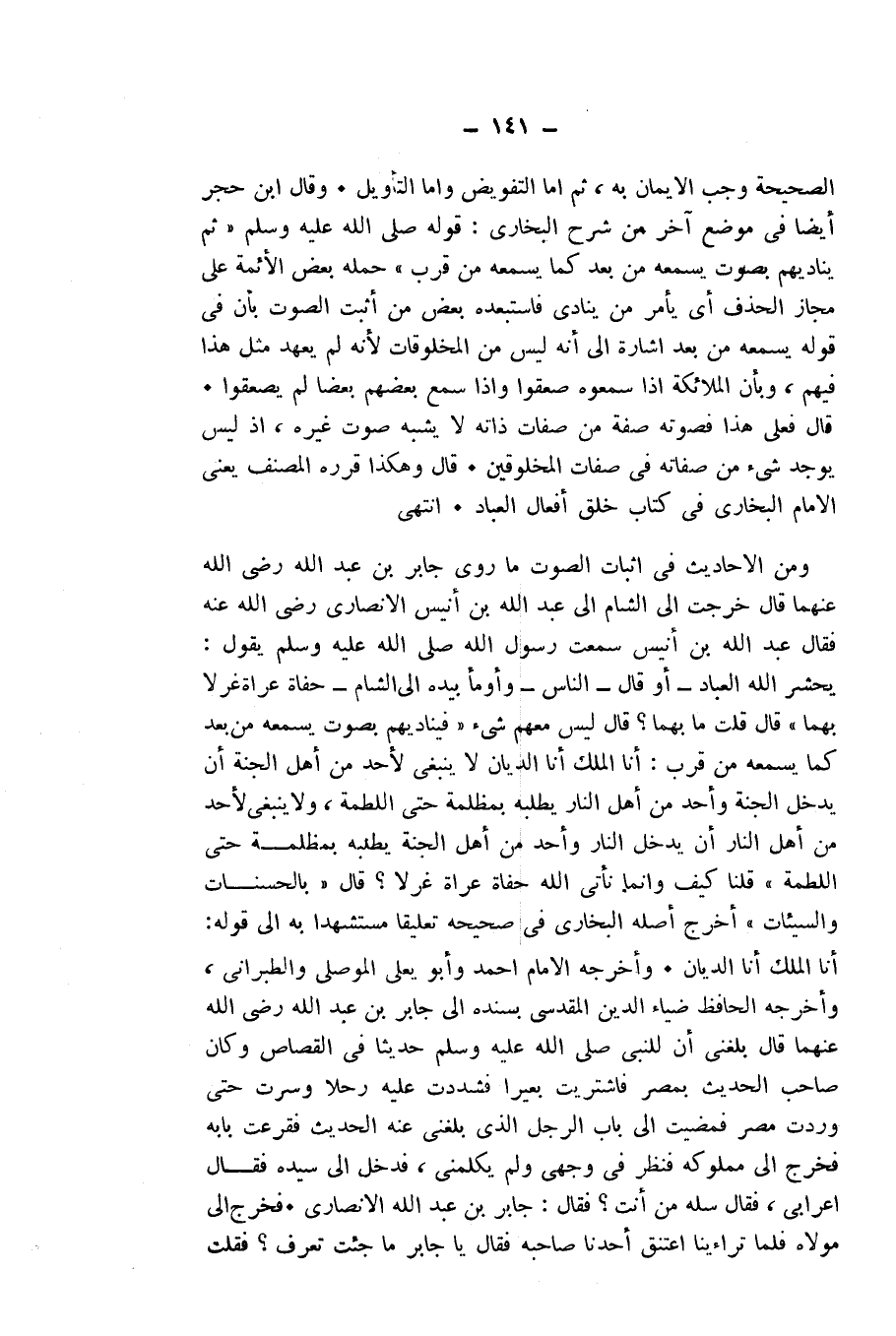 وَمِنَ الْأَحَادِيثِ فِي إِثْبَاتِ الصَّوْتِ مَا رَوَى جَابِرُ بْنُ عَبْدِ اللَّهِ - رَضِيَ اللَّهُ عَنْهُمَا - قَالَ: خَرَجْتُ إِلَى الشَّامِ إِلَى عَبْدِ اللَّهِ بْنِ أَنِيسٍ الْأَنْصَارِيِّ - رَضِيَ اللَّهُ عَنْهُ - فَقَالَ عَبْدُ اللَّهِ بْنُ أَنِيسٍ: سَمِعْتُ رَسُولَ اللَّهِ - صَلَّى اللَّهُ عَلَيْهِ وَسَلَّمَ - يَقُولُ: «يَحْشُرُ اللَّهُ الْعِبَادَ - أَوْ قَالَ النَّاسَ - وَأَوْمَأَ بِيَدِهِ إِلَى الشَّامِ، حُفَاةً عُرَاةً غُرْلًا بُهْمًا "، قَالَ قُلْتُ: مَا بُهْمًا؟ قَالَ: لَيْسَ مَعَهُمْ شَيْءٌ "، فَيُنَادِيهِمْ بِصَوْتٍ يَسْمَعُهُ مَنْ بَعُدَ، كَمَا يَسْمَعُهُ مَنْ قَرُبَ: " أَنَا الْمَلِكُ، أَنَا الدَّيَّانُ، لَا يَنْبَغِي لِأَحَدٍ مِنْ أَهْلِ الْجَنَّةِ أَنْ يَدْخُلَ الْجَنَّةَ وَأَحَدٌ مِنْ أَهْلِ النَّارِ يَطْلُبُهُ بِمَظْلَمَةٍ حَتَّى اللَّطْمَةُ، وَلَا يَنْبَغِي لِأَحَدٍ مِنْ أَهْلِ النَّارِ أَنْ يَدْخُلَ النَّارَ وَأَحَدٌ مِنْ أَهْلِ الْجَنَّةِ يَطْلُبُهُ بِمَظْلَمَةٍ حَتَّى اللَّطْمَةُ "، قُلْنَا: كَيْفَ وَإِنَّمَا نَأْتِي اللَّهَ حُفَاةً عُرَاةً غُرْلًا؟ قَالَ: " بِالْحَسَنَاتِ وَالسَّيِّئَاتِ» "، أَخْرَجَ أَصْلَهُ الْبُخَارِيُّ فِي صَحِيحِهِ تَعْلِيقًا مُسْتَشْهِدًا بِهِ إِلَى قَوْلِهِ: «أَنَا الْمَلِكُ أَنَا الدَّيَّانُ» . وَأَخْرَجَهُ الْإِمَامُ أَحْمَدُ وَأَبُو يَعْلَى الْمَوْصِلِيُّ وَالطَّبَرَانِيُّ، وَأَخْرَجَهُ الْحَافِظُ ضِيَاءُ الدِّينِ الْمَقْدِسِيُّ بِسَنَدِهِ إِلَى جَابِرِ بْنِ عَبْدِ اللَّهِ - رَضِيَ اللَّهُ عَنْهُمَا - قَالَ: بَلَغَنِي أَنَّ لِلنَّبِيِّ - صَلَّى اللَّهُ عَلَيْهِ وَسَلَّمَ - حَدِيثًا فِي الْقِصَاصِ، وَكَانَ صَاحِبُ الْحَدِيثِ بِمِصْرَ، فَاشْتَرَيْتُ بَعِيرًا فَشَدَدْتُ عَلَيْهِ رَحْلًا، وَسِرْتُ حَتَّى وَرَدْتُ مِصْرَ، فَمَضَيْتُ إِلَى بَابِ الرَّجُلِ الَّذِي بَلَغَنِي عَنْهُ الْحَدِيثُ، فَقَرَعْتُ بَابَهُ فَخَرَجَ إِلَيَّ مَمْلُوكُهُ، فَنَظَرَ فِي وَجْهِي وَلَمْ يُكَلِّمْنِي، فَدَخَلَ إِلَى سَيِّدِهِ فَقَالَ: أَعْرَابِيٌّ، فَقَالَ: سَلْهُ مَنْ أَنْتَ؟ فَقَالَ: جَابِرُ بْنُ عَبْدِ اللَّهِ الْأَنْصَارِيُّ. فَخَرَجَ إِلَيَّ مَوْلَاهُ، فَلَمَّا تَرَاءَيْنَا اعْتَنَقَ أَحَدُنَا صَاحِبَهُ، فَقَالَ: يَا جَابِرُ، مَا جِئْتَ تَعْرِفُ؟ فَقُلْتُ: